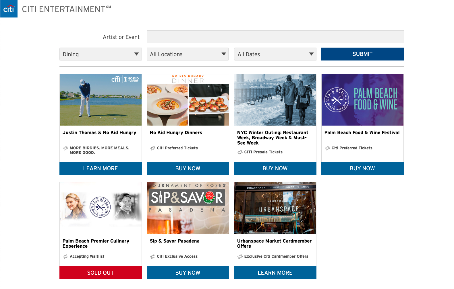 If you have a Citi credit card such as the Citi Prestige® Card or the Citi Premier® Card, you can take advantage of the issuer's Citi Entertainment events. Along with music, sports and theater performances, card holders can purchase tickets to dining and beverage happenings that are not usually available to the general public, or that offer more perks than what your average consumer can enjoy.