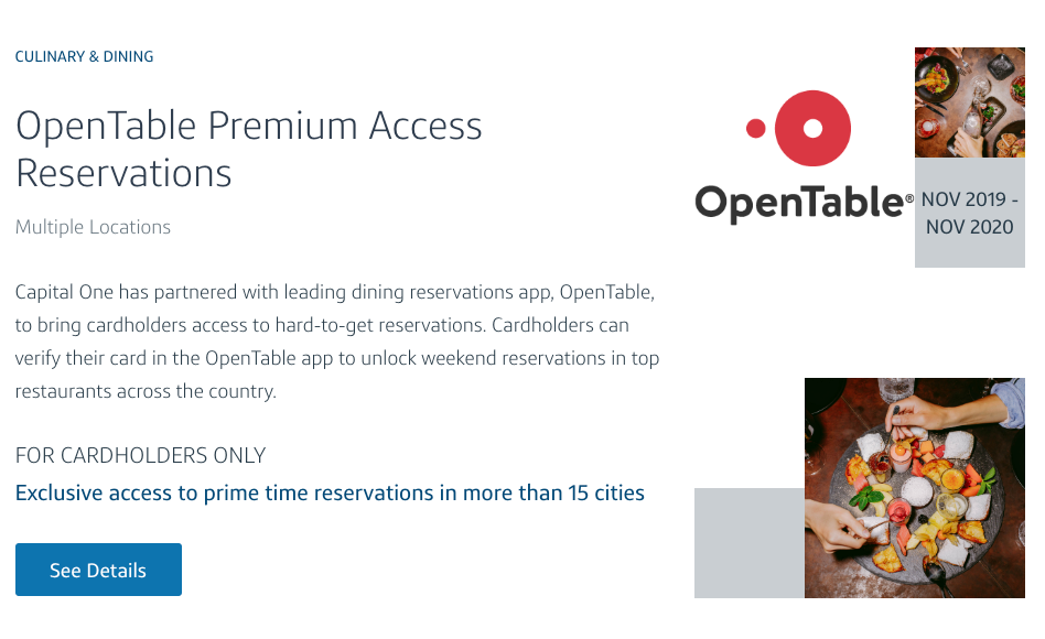 Like Amex, Chase and Citi, Capital One has an events portal for card holders, called Capital One Access, that includes a few foodie-focused benefits. The program has recently partnered with OpenTable on a few initiatives to offer cardholders access to hard-to-get reservations. The offer is available in 15 U.S. cities with up to 20 restaurant reservations available in some cities.