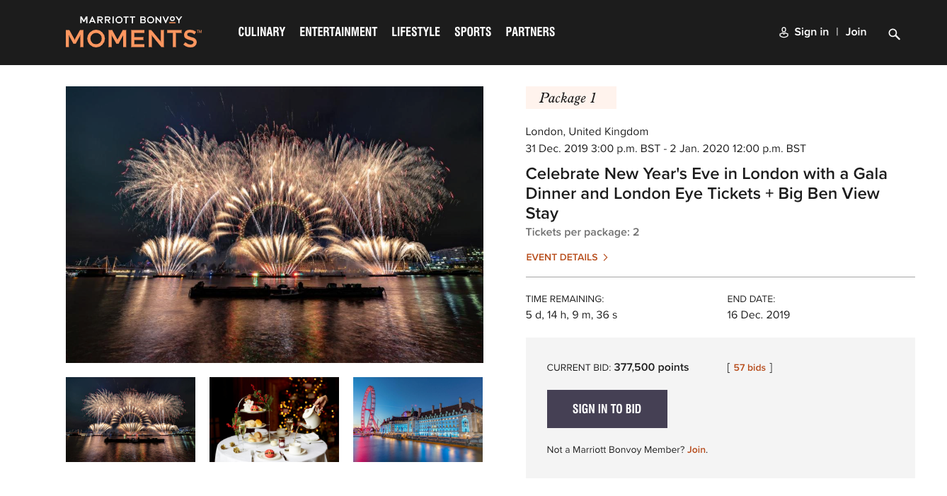 For instance, bids for this New Years Eve gala dinner in London is currently up to 377,700 points at press time.