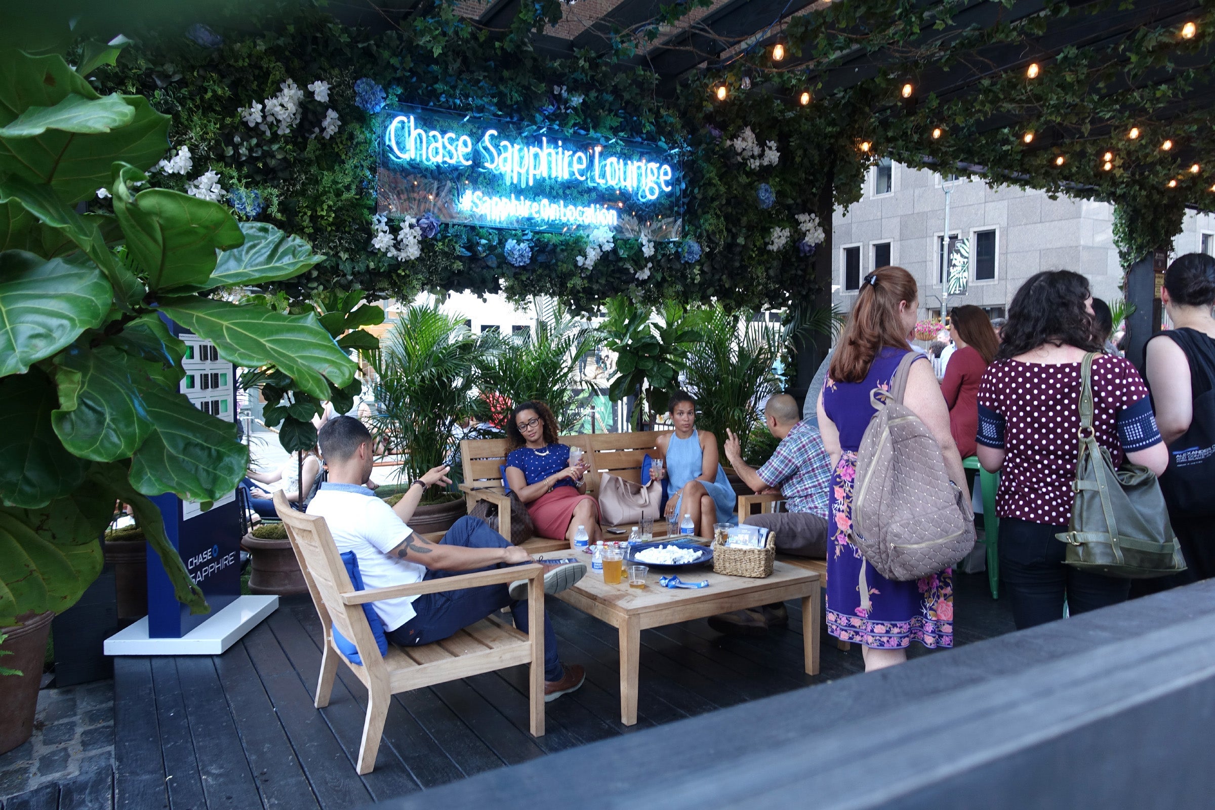 Located at the Seaport's temporary Garden Bar on Fulton Street, the Chase Sapphire Lounge is accessible to Chase Sapphire Preferred Card and Chase Sapphire Reserve cardholders — just flash your card to get inside.