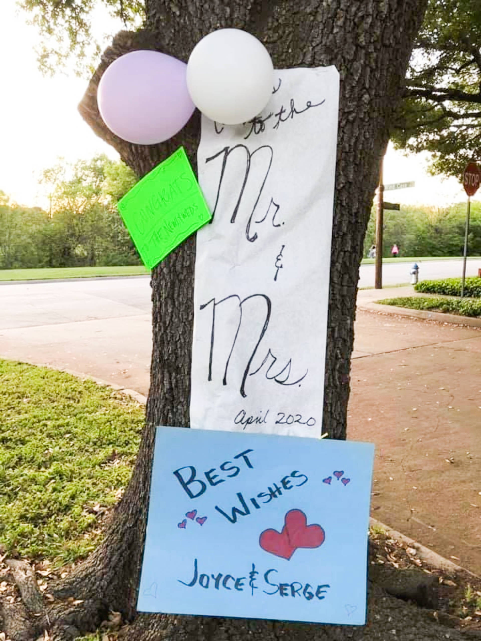 Once again, the couple made lemonade from lemons by deciding to keep the ceremony in their living room on their original Saturday date, but also host a drive-by car parade with local friends on Friday evening.
