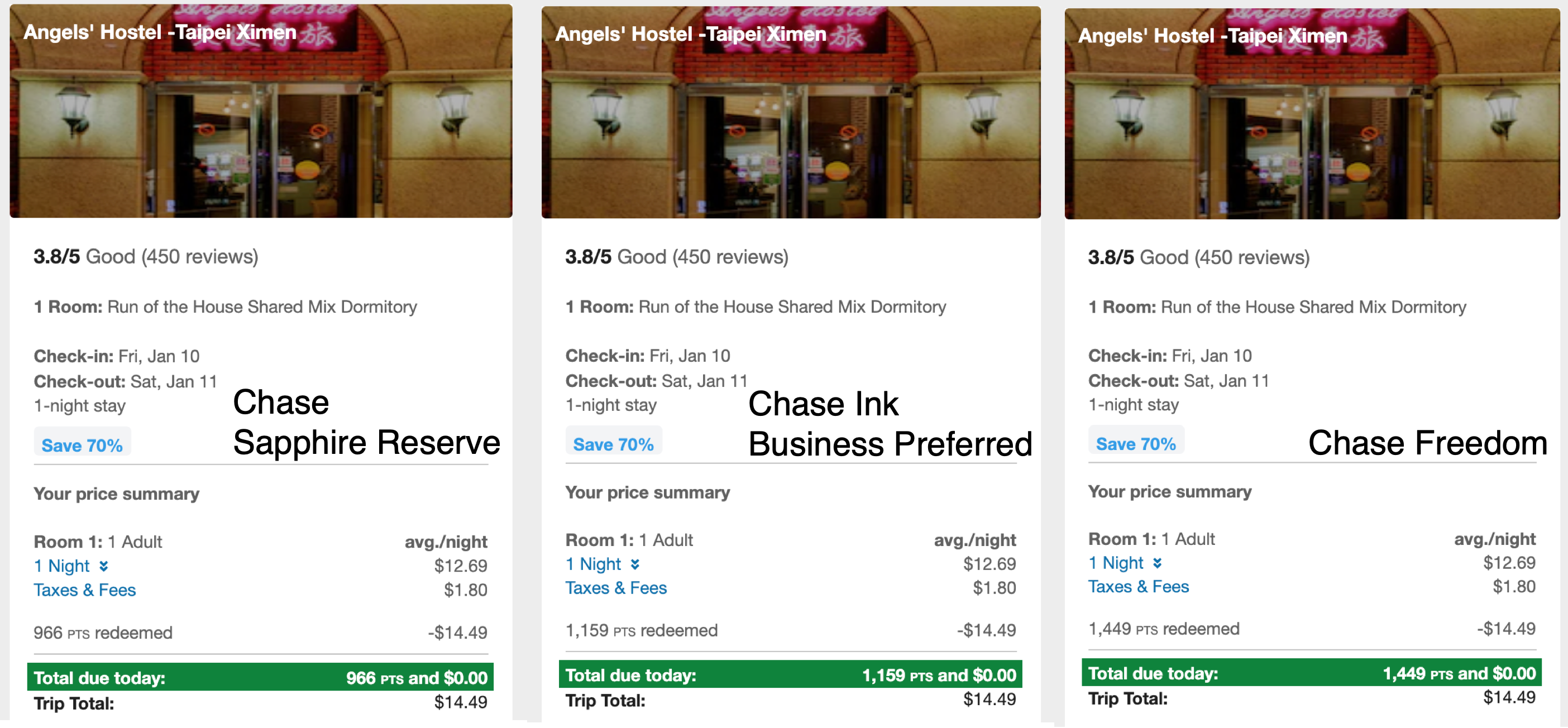 In the example above, check out how much a $14.49/night hostel would cost me in points across my three Ultimate Rewards cards.