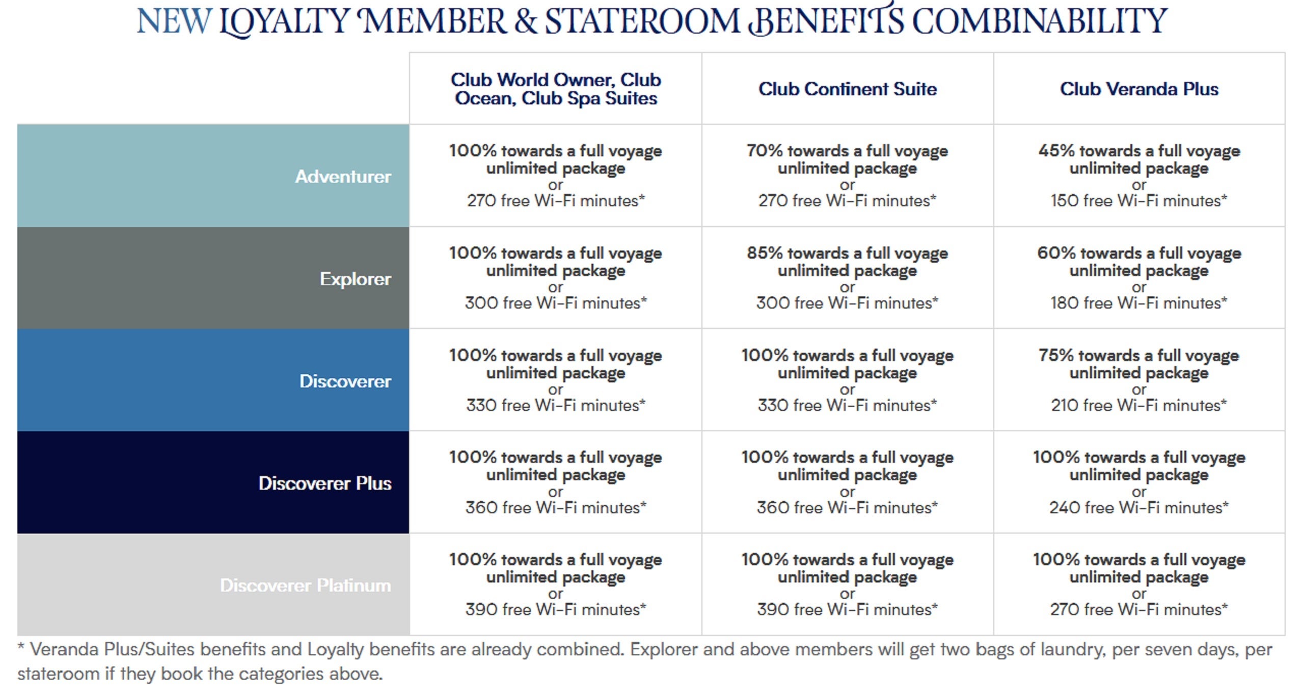Additionally, passengers at Explorer level or higher will receive two bags of complimentary laundry service if booked in any of the cabin categories listed on the chart below.