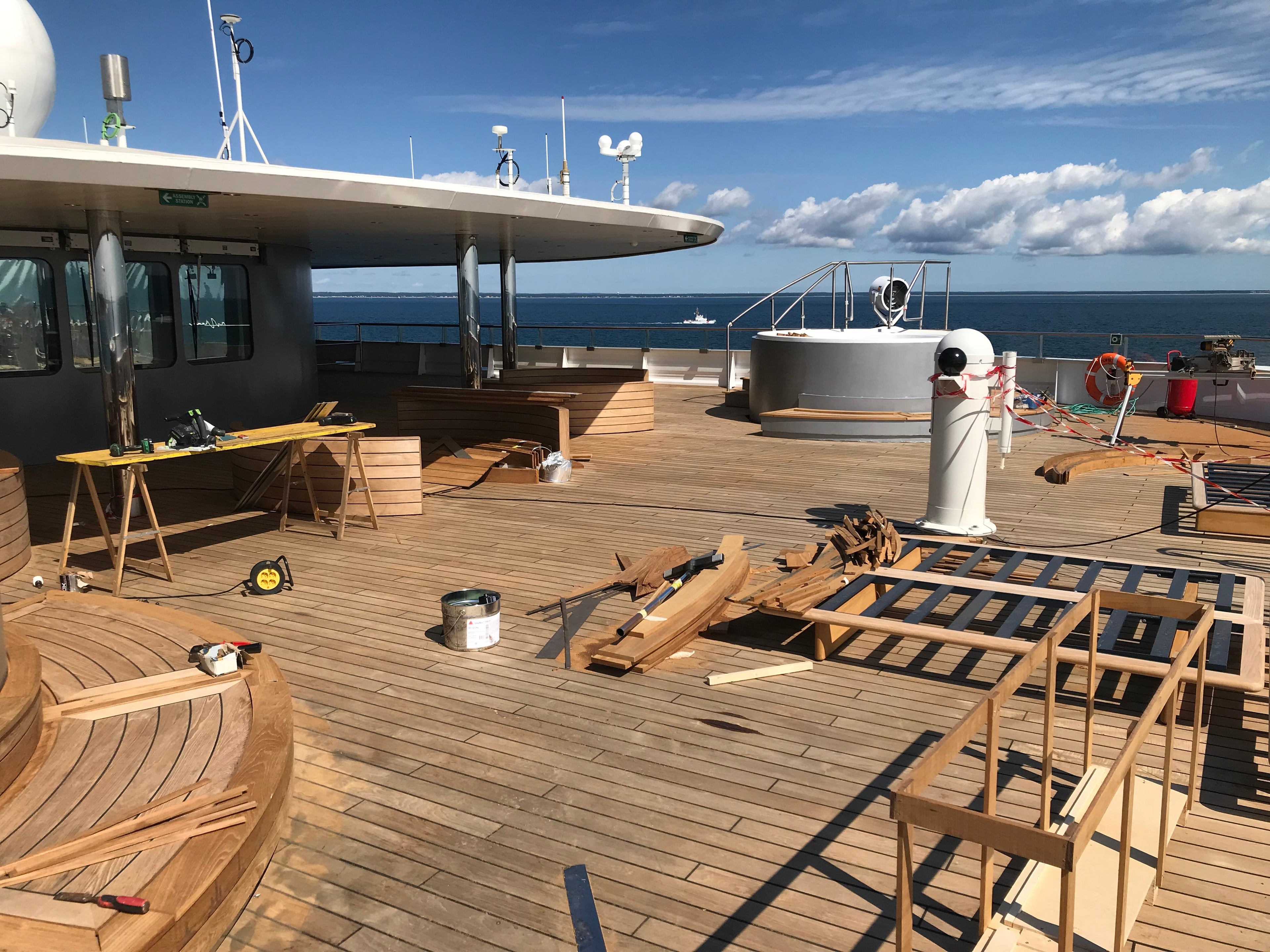 The main outdoor lounge area atop the 228-passenger Scenic Eclipse remained under construction for several weeks after the ship debuted in 2019. GENE SLOAN/THE POINTS GUY