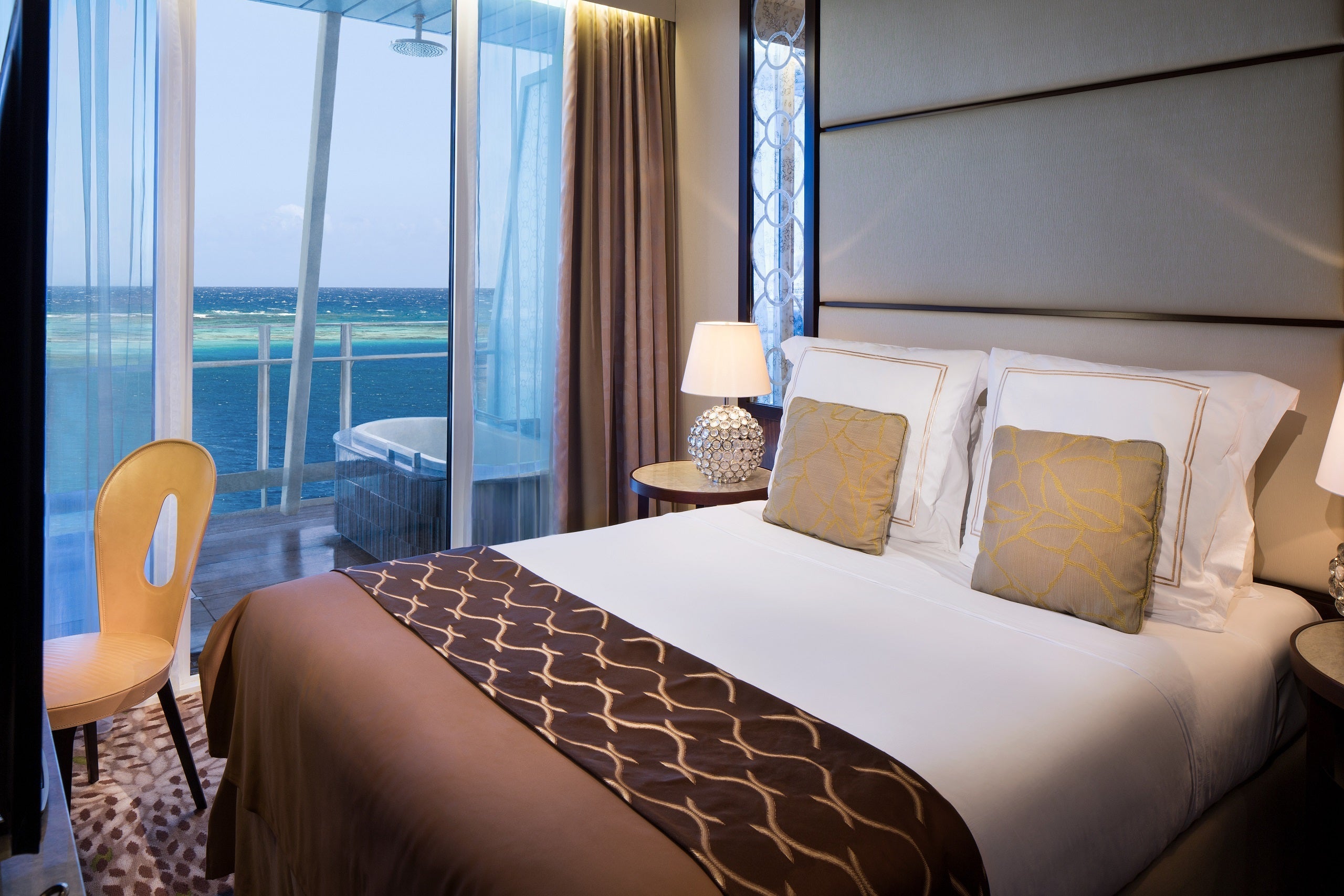 At nearly four times the size of Signature Suites, Reflection Suites come equipped with two bedrooms, two bathrooms and a cantilevered glass shower that hangs out over the ocean for simply amazing views. All of this fits neatly into 1,636 square feet of space, plus a 194-square-foot balcony. Dual sinks, a separate soaking tub with a rain shower, high ceilings, a walk-in closet, and a prime corner location round out the opulent offerings. These suites are only slightly smaller than Iconic Suites, but their verandas are far tinier.