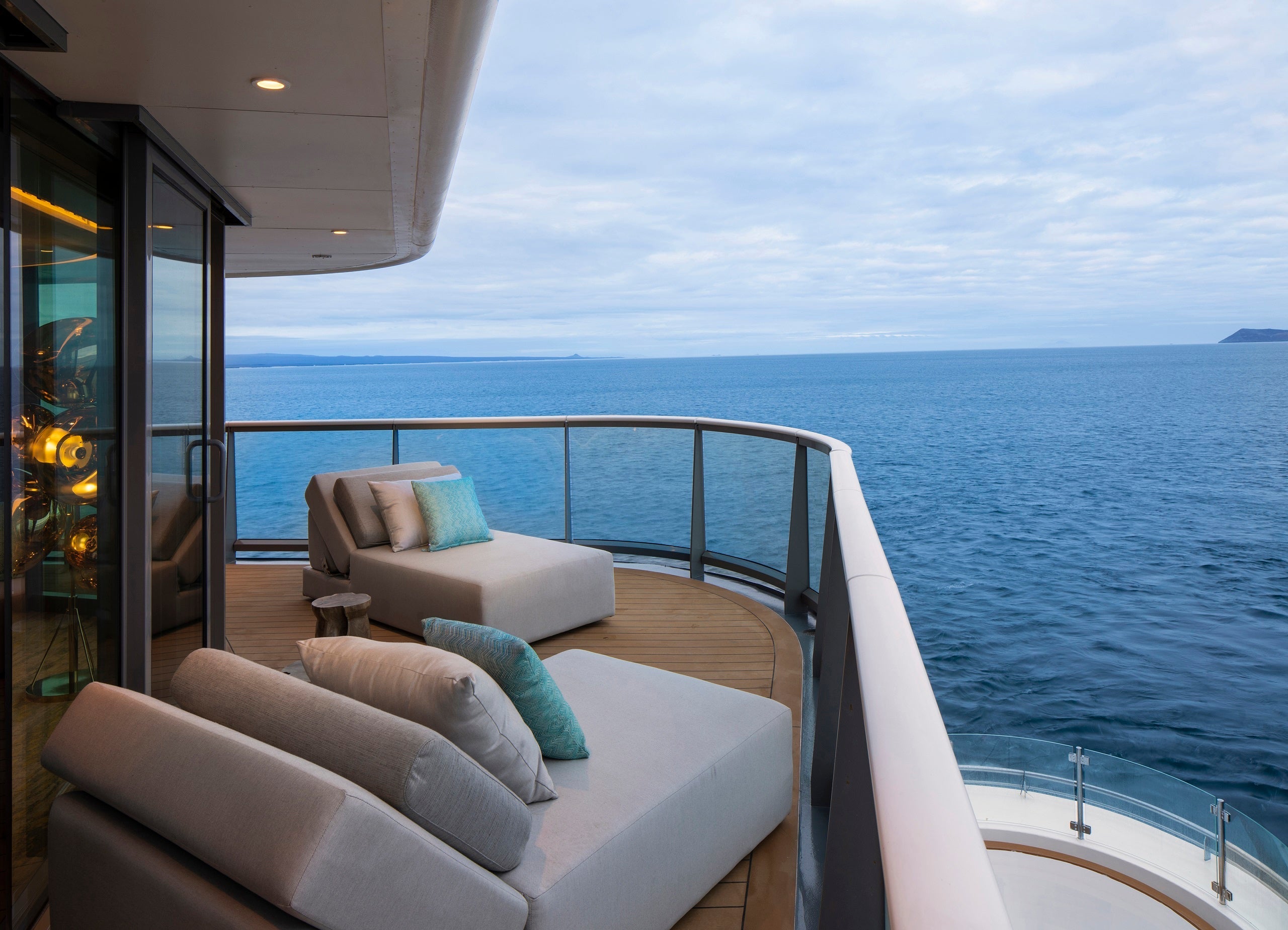 The tiniest and most no-frills option on Celebrity's roster is Celebrity Xploration, which carries just 16 people in eight cabins at its maximum. Oddly, all staterooms are labeled as Junior Suites, but while half of them have balconies (180 square feet with 245-square-foot verandas), the other half (190 square feet) don't. It's also interesting to note that, in the ones that do have them, the balconies boast significantly more space than the interior living area does.