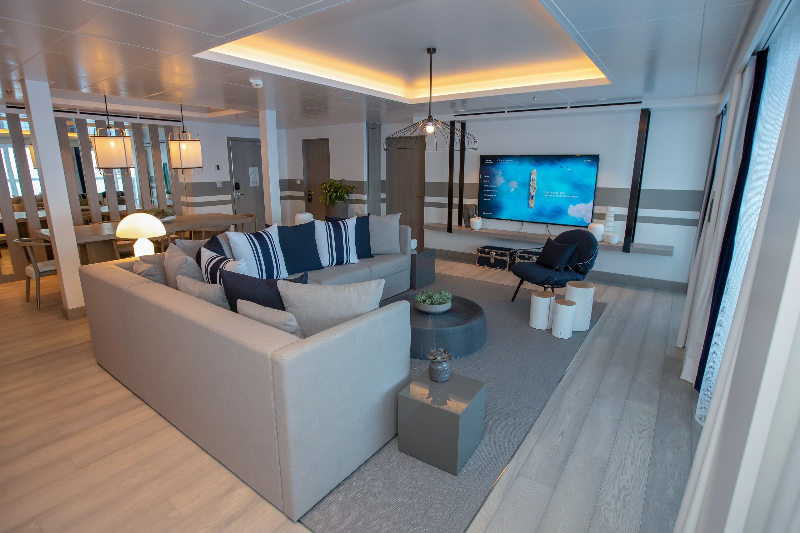 These two-deck suites offer an upstairs-and-downstairs setup with one bedroom, two bathrooms, and a living room in 739 square feet of space. There's also a 211-square-foot balcony. These rooms are exclusive to the line's Edge Class of ships, and they boast access to a private plunge pool.