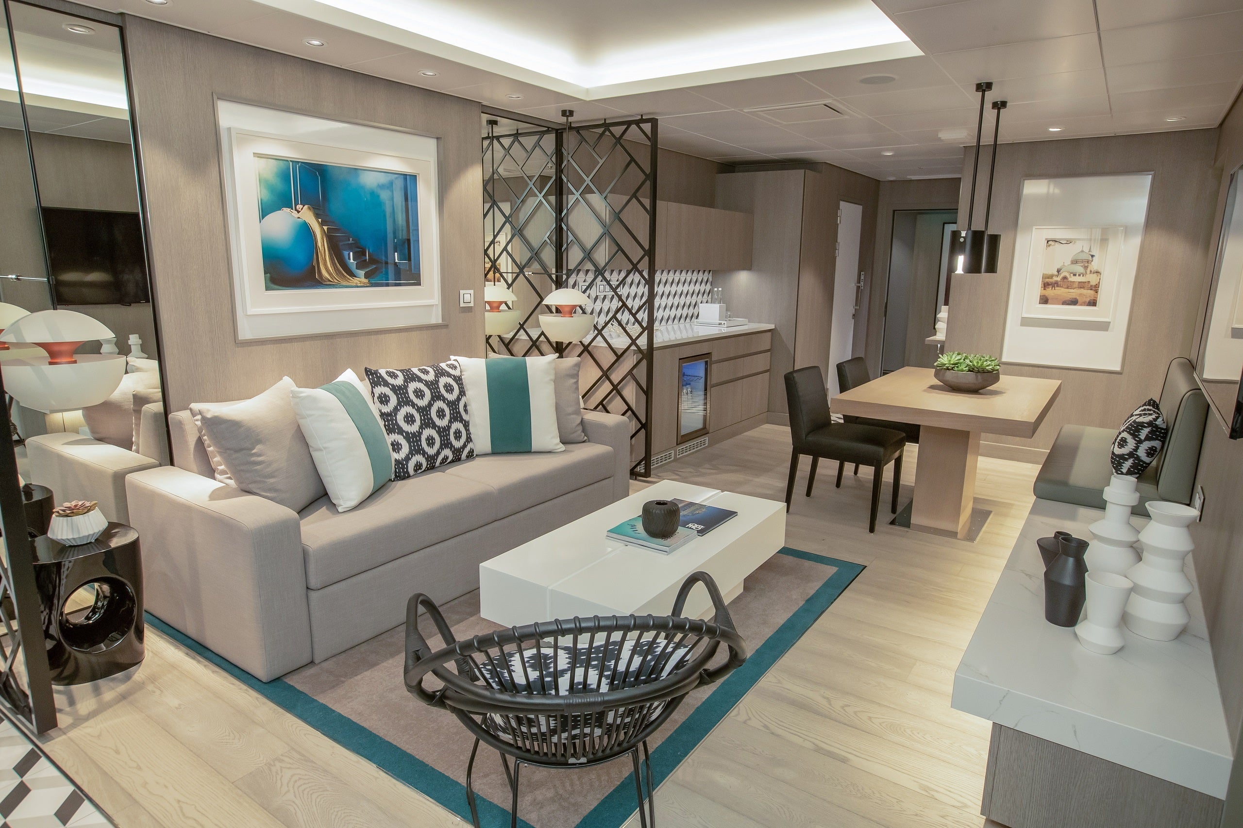These are the smallest suites in the fleet, ranging from 251 to 362 square feet with balconies that range from 57 to 163 square feet. They're arranged in a studio configuration, similar to what you'd find in non-suite cruise-ship accommodations. They're the least expensive option for those who crave access to suite-level amenities.