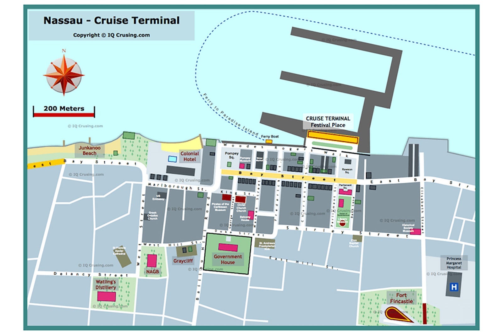 On foot: Many of Nassau's historic sites and the Bay Street retail district are within walking distance of the cruise ship pier and the downtown area. Bay Street is lined with shops, restaurants and bars, and cruisers who are so inclined can spend the day walking the area.