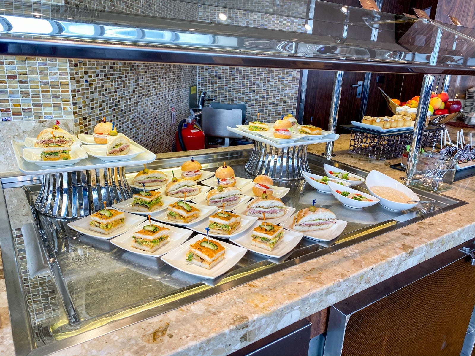 Amenities: Complimentary snacks throughout the day including sandwiches and pastries, coffees and teas, and newspapers.