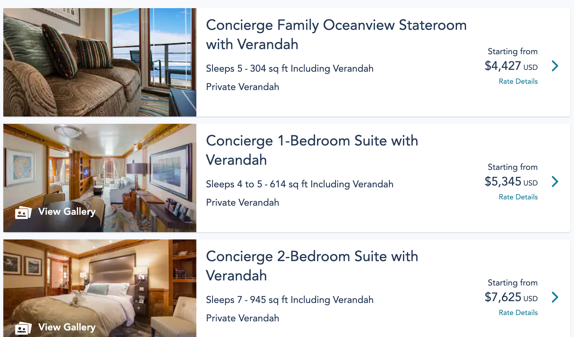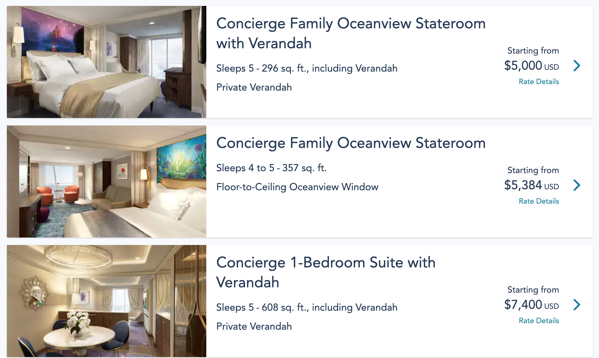 When I priced out Disney Cruise Line concierge rooms, cruise fares started at just over $3,000 for a short sailing for two people. Prices go up to tens of thousands of dollars for concierge level for the larger suites or on longer sailings.