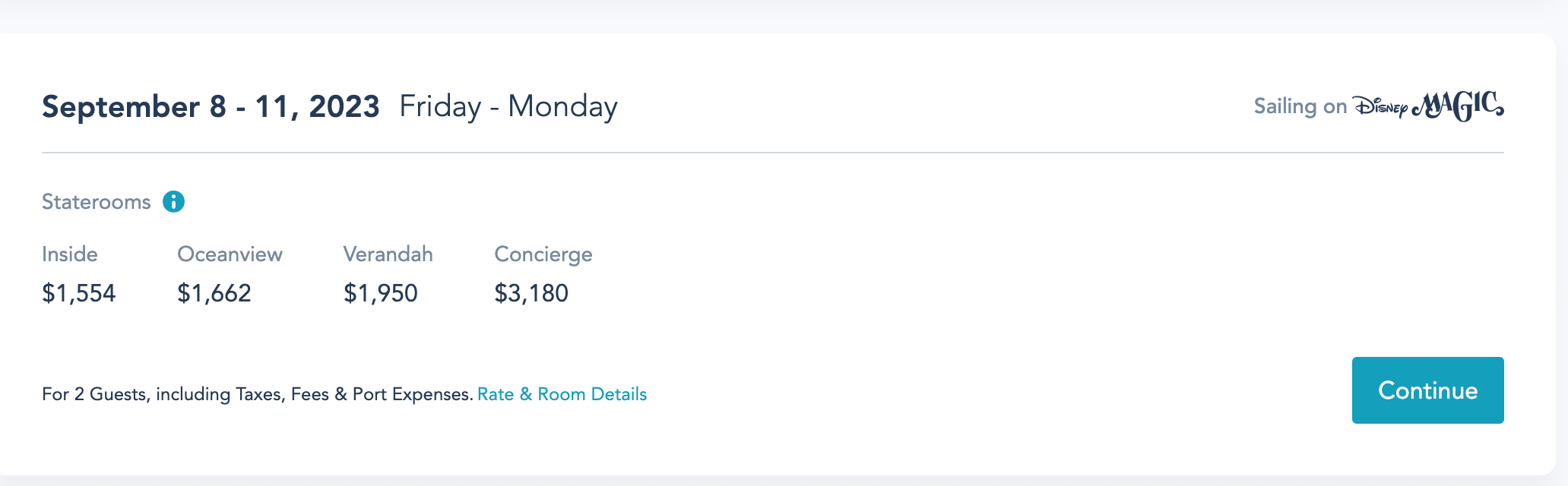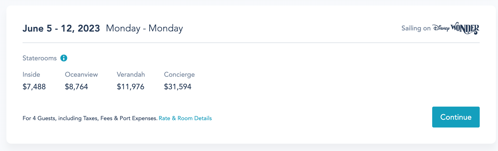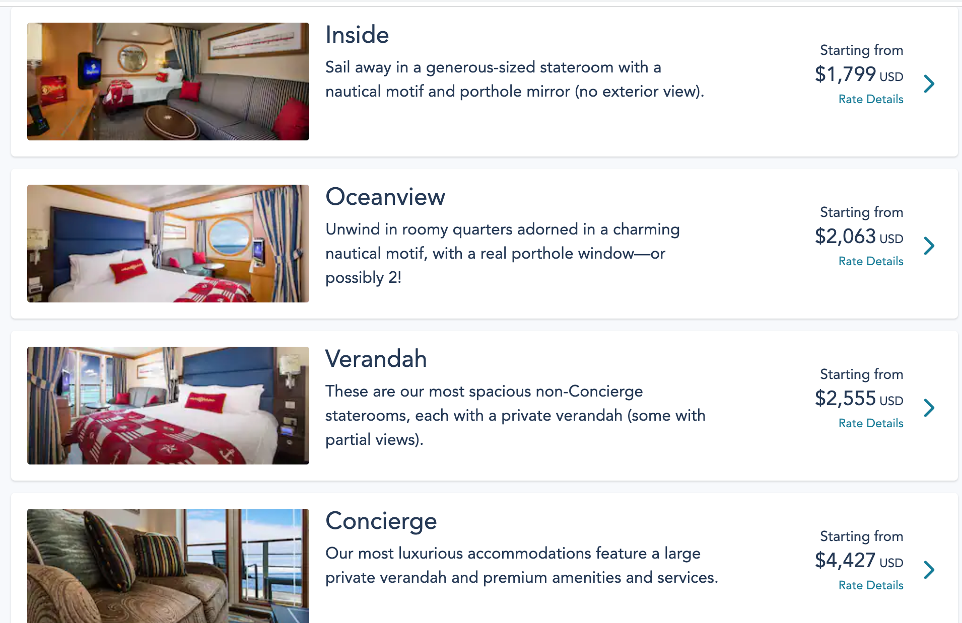Looking about a year out on a short three-night Disney cruise from Florida to the Bahamas (including a stop at Disney's Castaway Cay), prices for an interior stateroom start at $1,554 for double occupancy or $2,555 for a family of four. On the same cruise, a non-concierge verandah room starts at $1,950 for two or $3,051 for four.