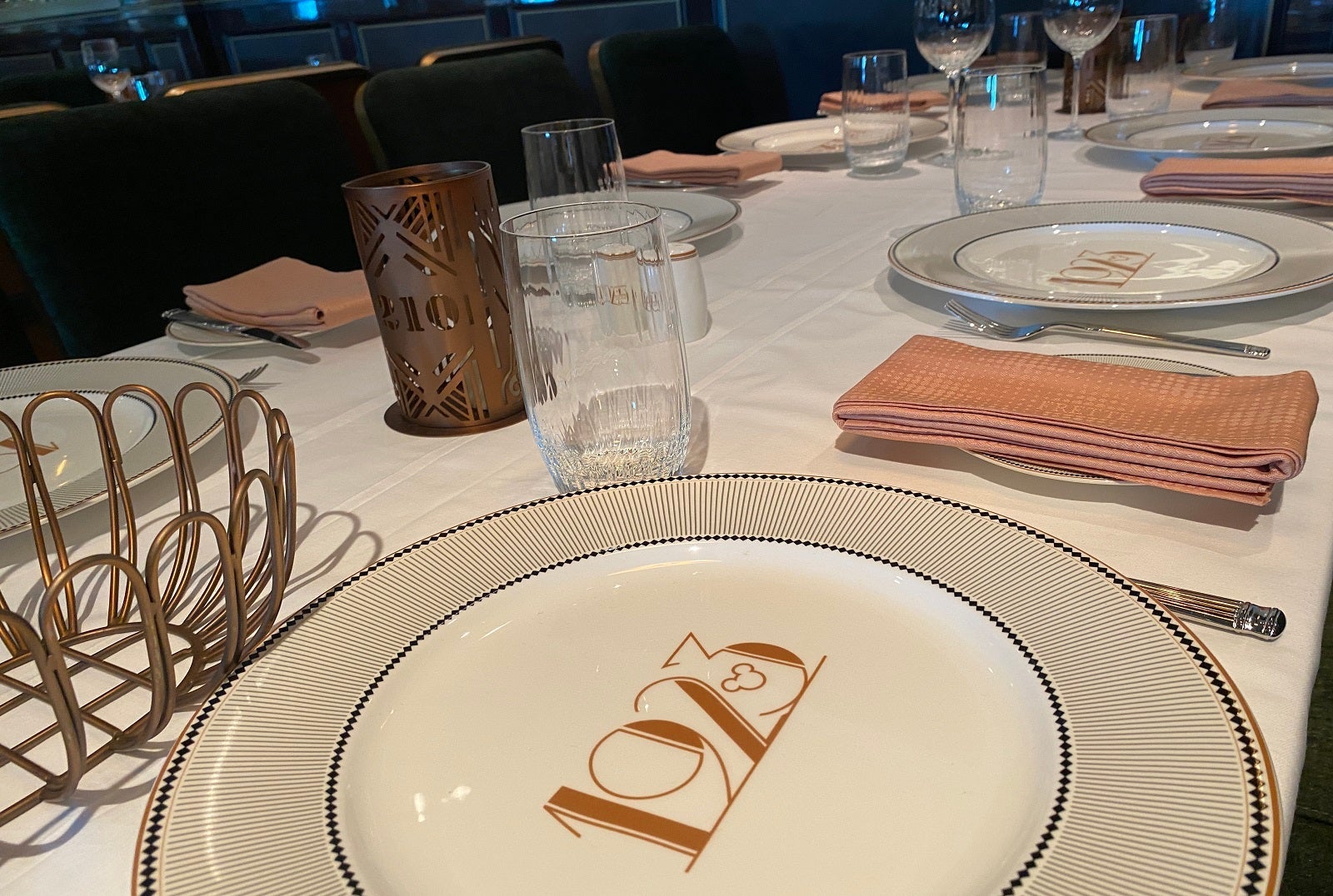 Plates in the 1923 dining room on Disney Wish. ASHLEY KOSCIOLEK/THE POINTS GUY