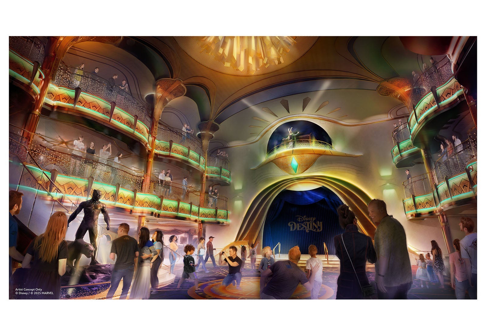 In the ship's Grand Hall, you'll find a very different look and feel than the Cinderella "enchantment" vibes on Disney Wish. Instead, Disney Destiny will feature a statue of T'Challa from the "Black Panther" and a color palette all around the massive atrium that's inspired by the fictional Kingdom of Wakanda.