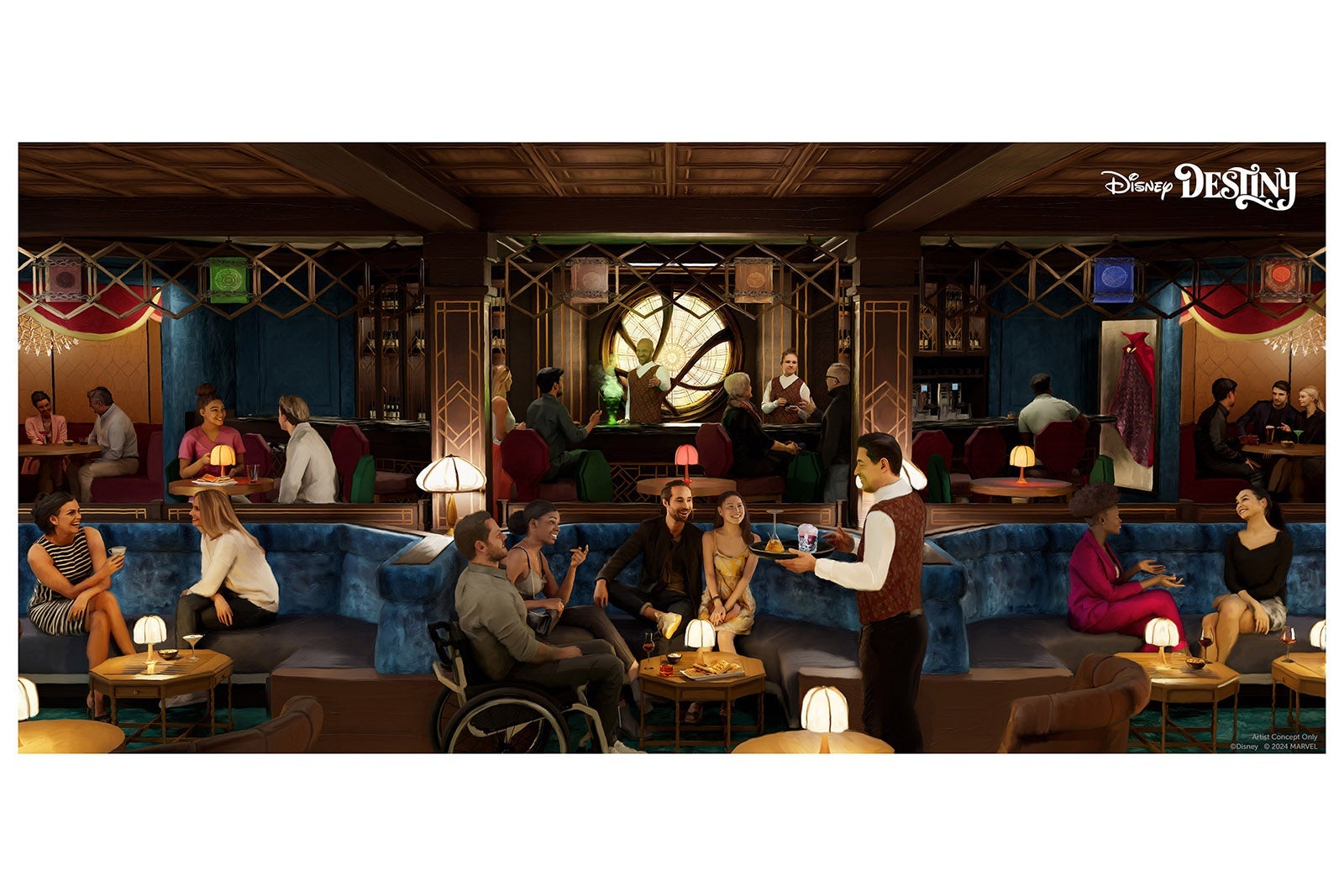 Another new lounge on Disney Destiny, The Sanctum, is inspired by Doctor Strange's New York Sanctum and his sorcery. The space will feature a massive circular mirror behind the bar and might even hold a few mystical artifacts. Cruisers who pop in for a visit can expect a variety of surprises, including "upside-down" glassware. In addition to some "strange" cocktails, you'll also find stuffed waffles available for purchase.