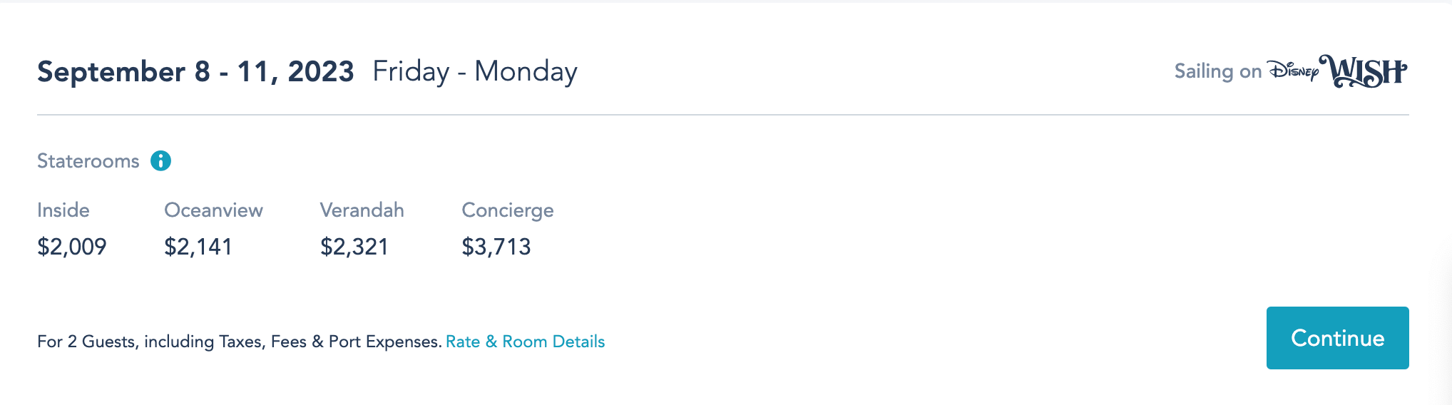 For the least expensive three-night sailings on Disney Wish, expect to pay at least $3,700 for double occupancy or around $5,300 for two adults and two children in the same cabin.