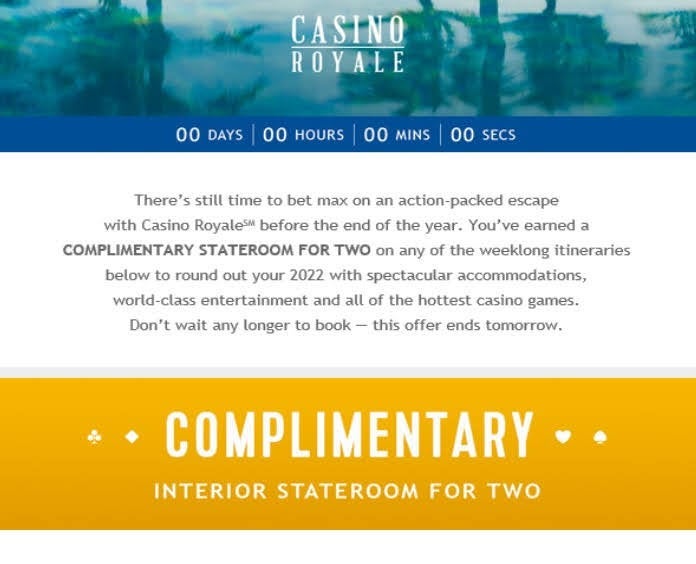 The third opportunity for Club Royale members to earn rewards is the most mysterious. This is when the cruise line selects recipients based on demographic criteria such as age, place of residency, number of times cruised per year, average bet, average time spent in the casino or even marital status and sends them targeted offers, which can range from $100 off a cruise to complimentary junior suites. These marketing-based offers are usually limited to specific sailings, often with close-in dates, for a range of cruise lengths and cabin categories. Members report receiving them by snail mail, email or strictly via the Club Royale member website.