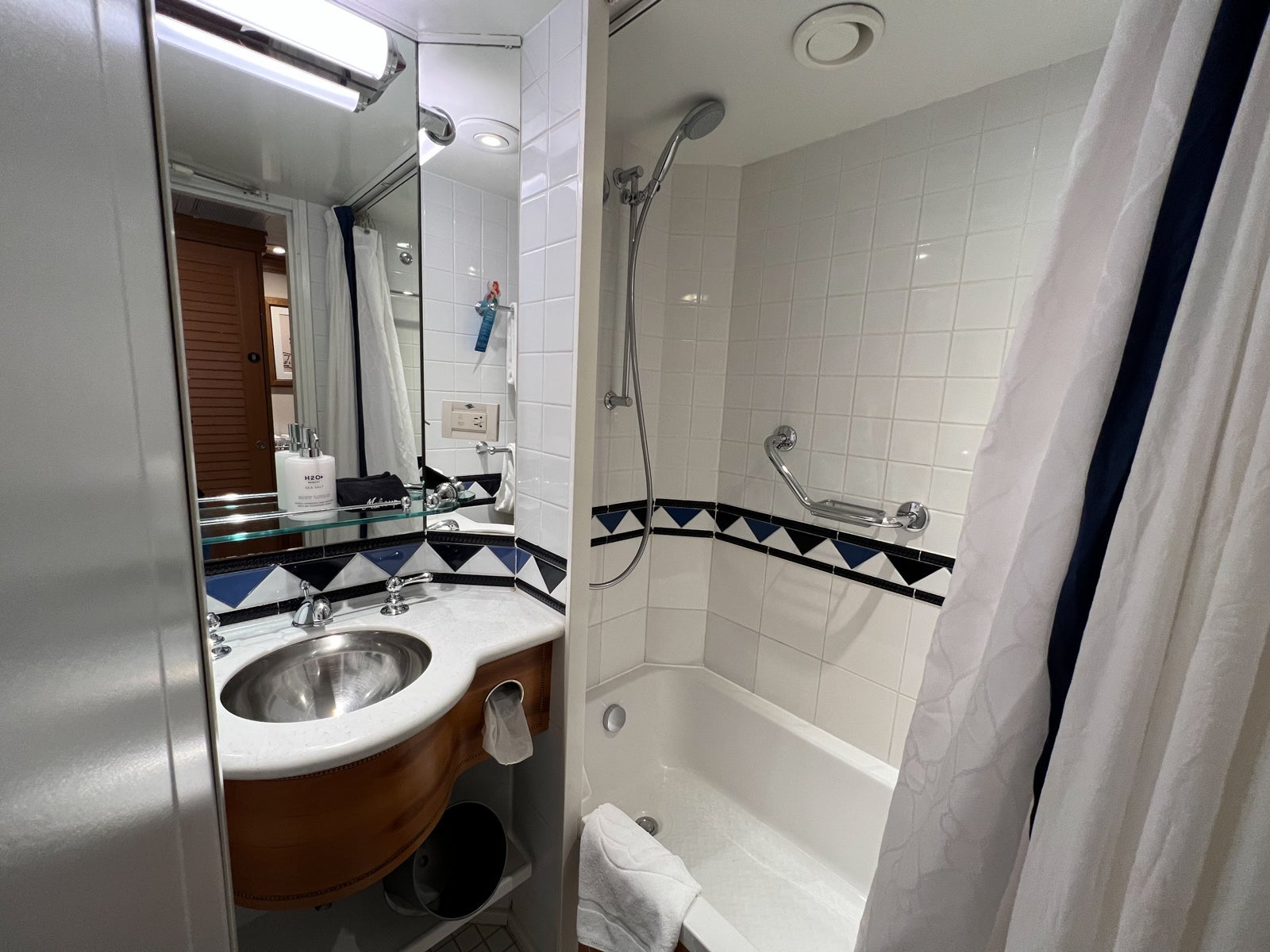 This room type, like most on Disney Cruise Line, has a split bathroom design. There's a sink and shower in one small bathroom, and a sink and toilet in another. This arrangement allows more guests to get ready at the same time.