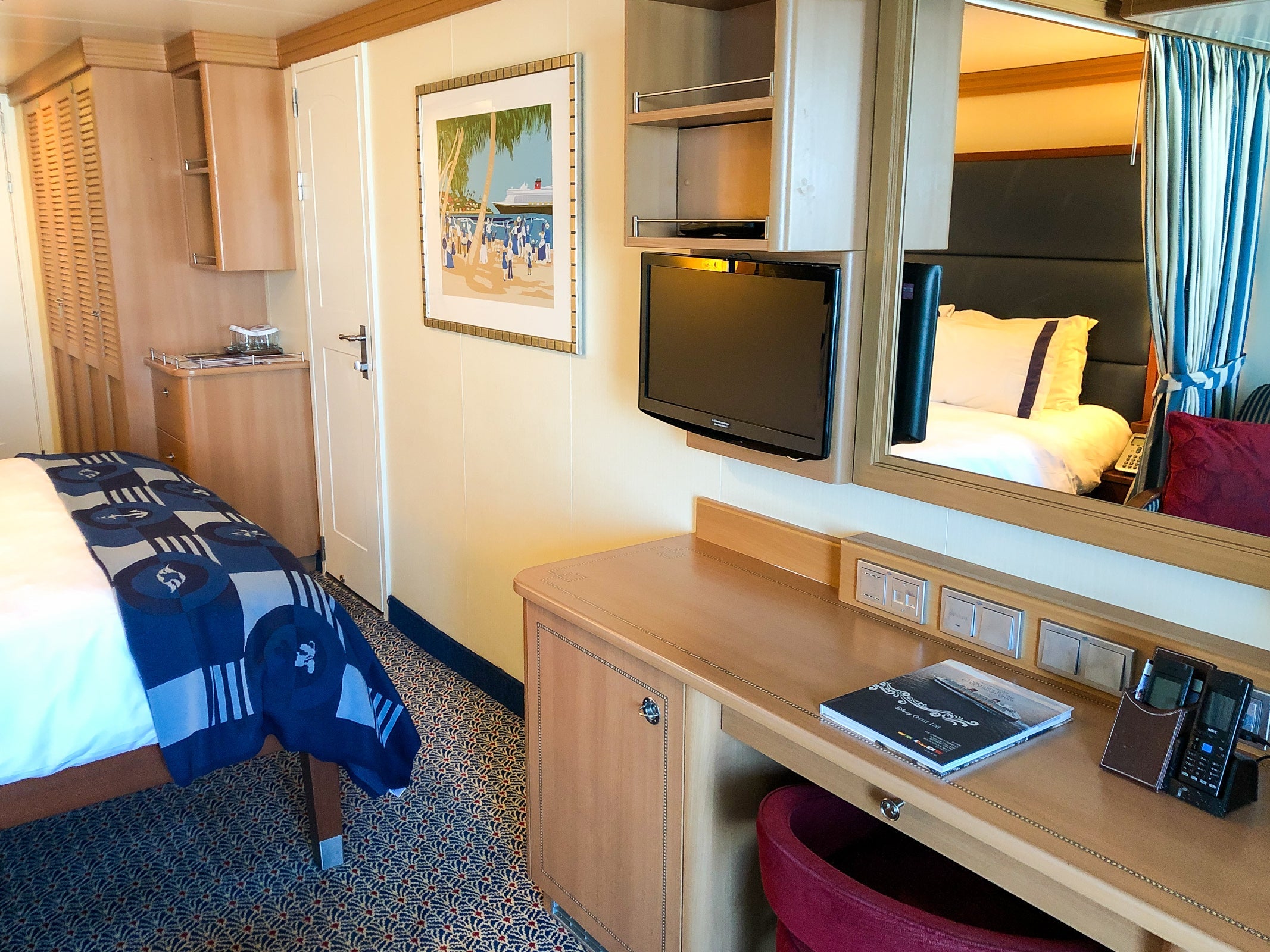 Each had one queen bed, a single sleeper sofa and a pulldown berth bed. I did not trust all four of us would fit night after night perfectly with that arrangement, so we doubled those numbers with connecting and identical rooms. I am very glad that we made that choice, as space was tight for someone not used to cruises once our actual stuff was everywhere.