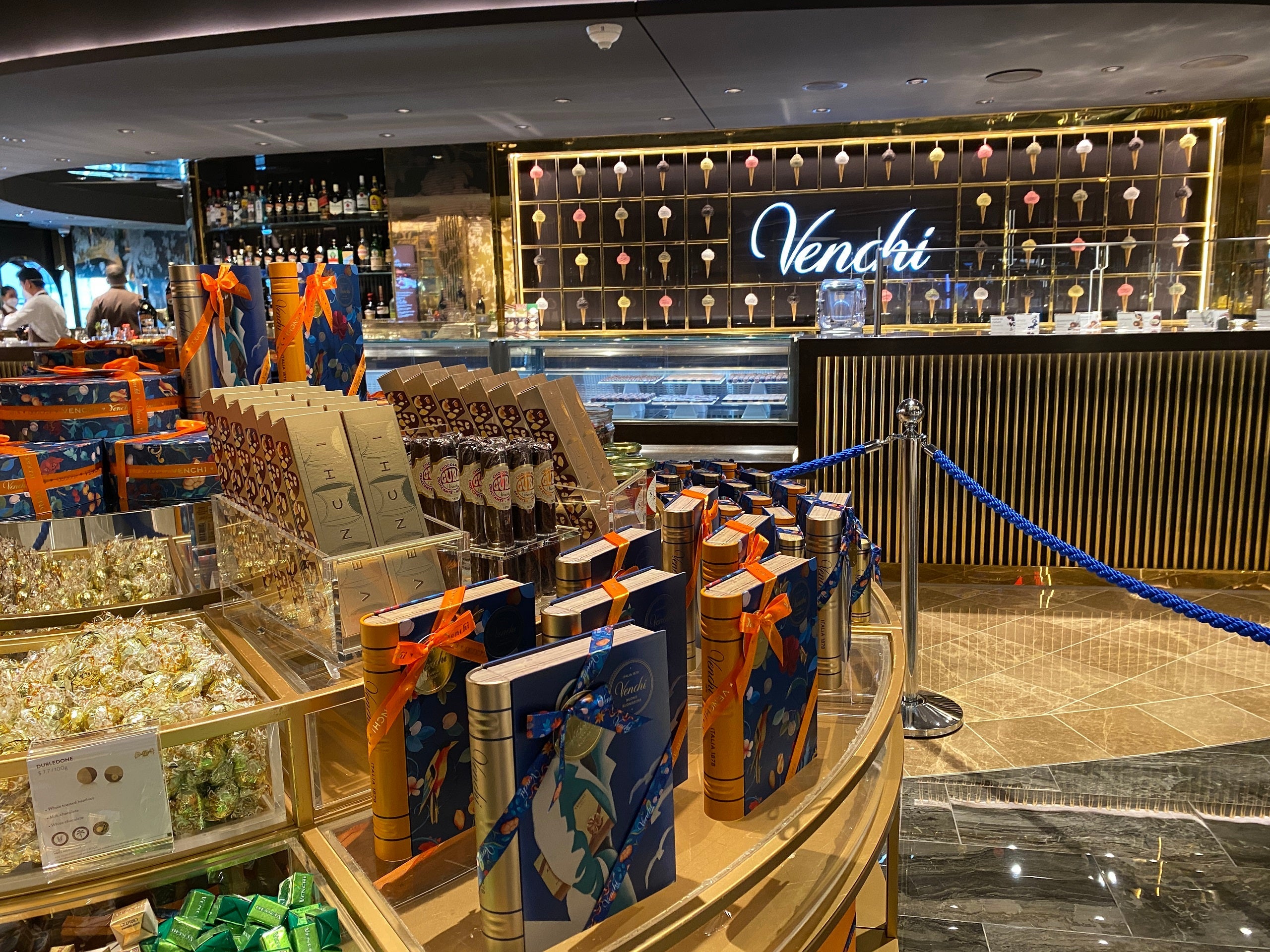 My absolute favorite place to grab a snack and a cappuccino is the Venchi 1878 Chocolate Bar. Located on Deck 6, near Times Square (which, unexpectedly, often afforded me a quiet place to work during the day), it offers tasty coffee beverages and chocolate-themed drinks (read: fancy Italian hot chocolate and chocolate cocktails), as well as chocolate candies, via a partnership with the famous Venchi Italian chocolatier.