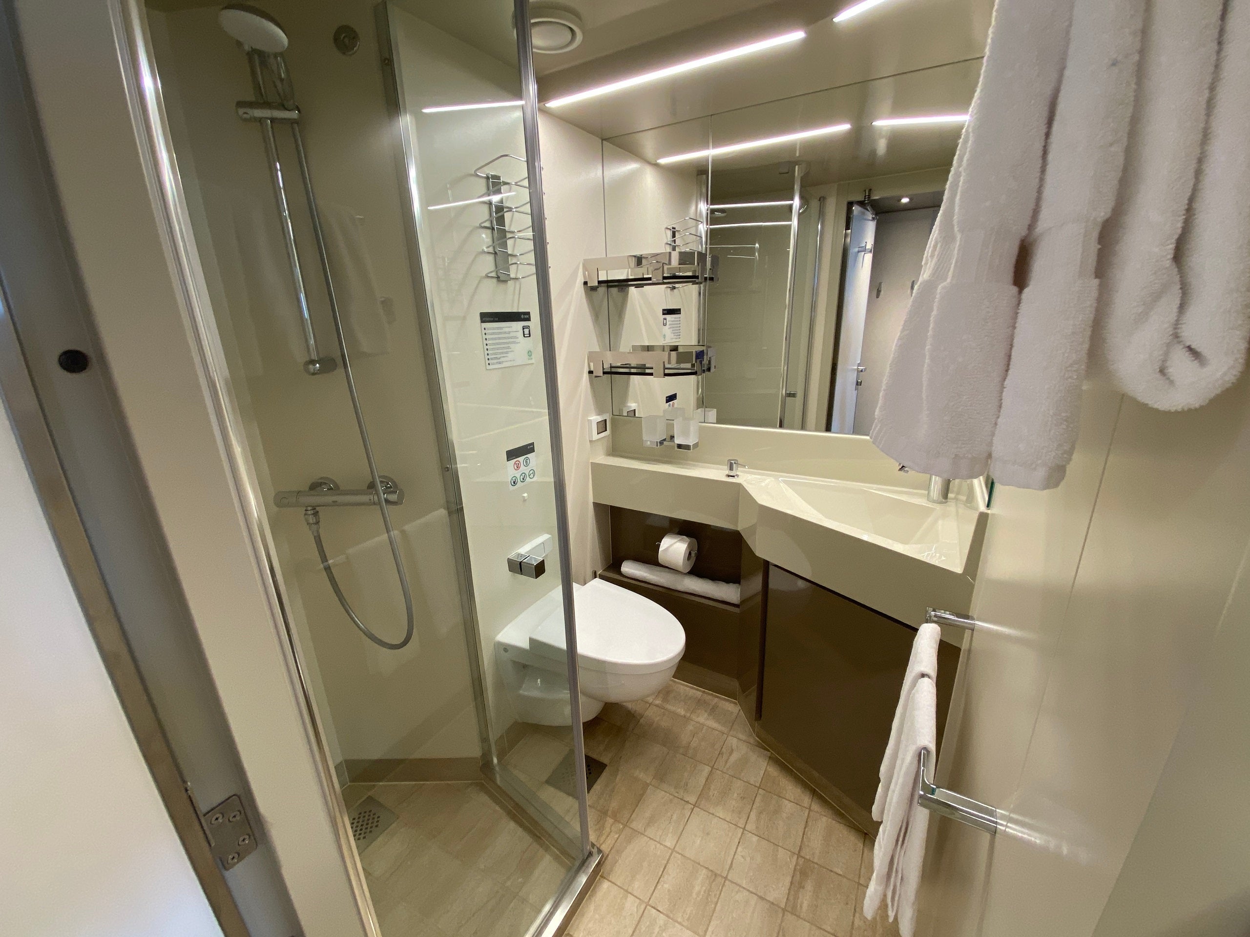 The bathroom in my balcony cabin on MSC Seashore. (Photo by Ashley Kosciolek/The Points Guy)