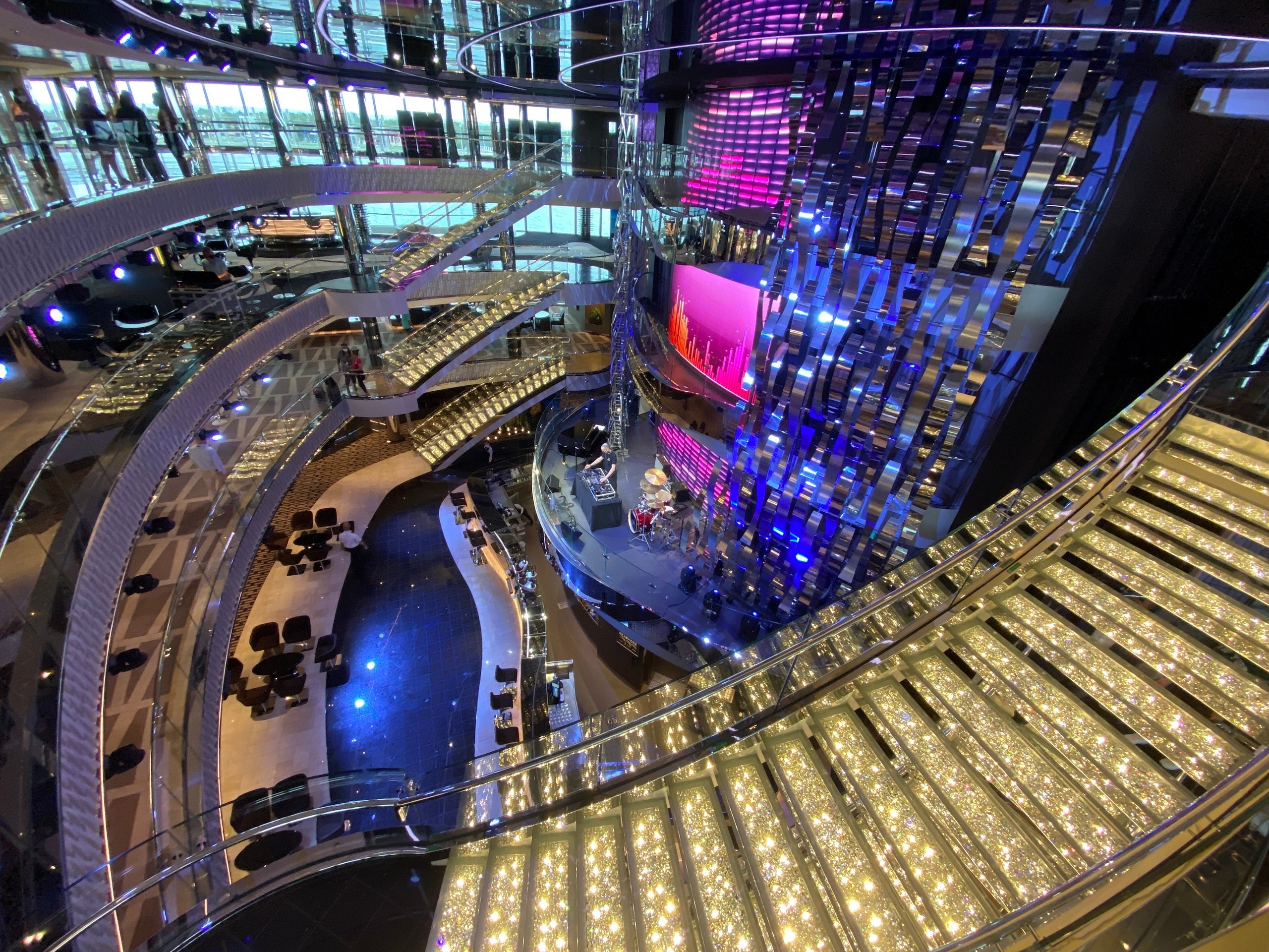 The four-deck atrium on MSC Seashore is a hub of social activity, featuring a bar and lounge, LED screens, performance spaces and staircases inlaid with Swarovski crystals. (Photo by Ashley Kosciolek/The Points Guy)