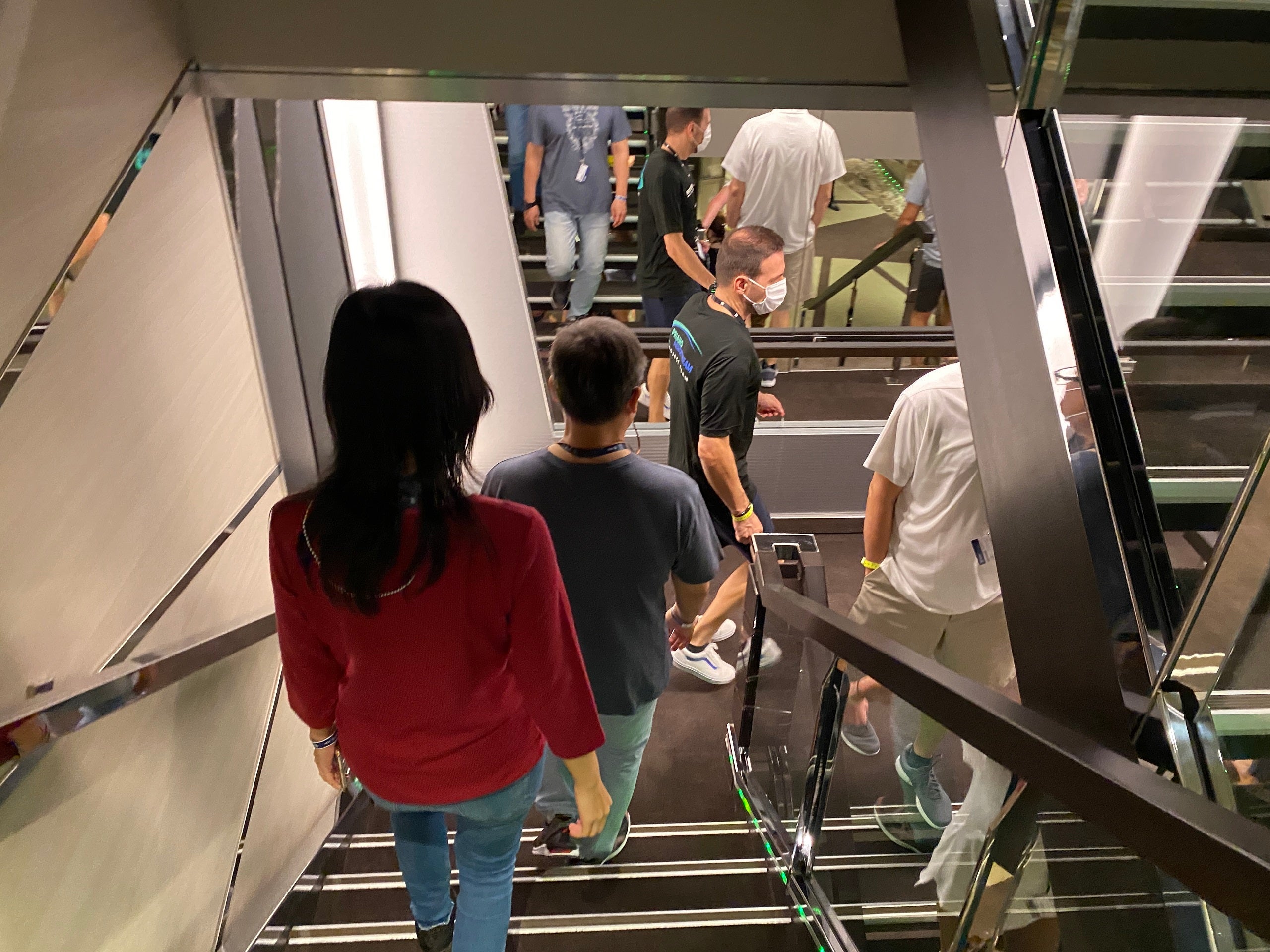 There are no buttons to push once you're inside the elevators. That means you can't walk up to a bay and piggyback on someone else's ride unless you feel like a rousing game of deck roulette. If you walk into an open car before making a floor selection, you'll be at the mercy of wherever the car is headed next. It also means you can't change your mind about where you want to go after you've entered the car (unless someone else is already going there and selected that deck number before getting inside).