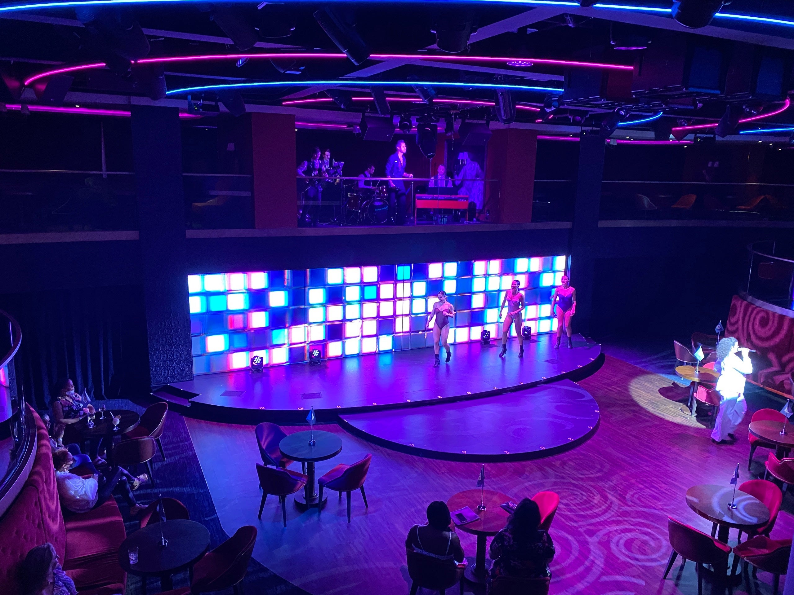 One other new highlight was Le Cabaret Rouge, which serves as a secondary performance space featuring a DJ and nightly shows that set the works of great artists to modern-day music. The lounge has a decidedly French vibe (lots of red velvet) and an interesting viewing setup with both floor seating and chairs set against a high-top bar that runs along a balcony overlooking the stage area.
