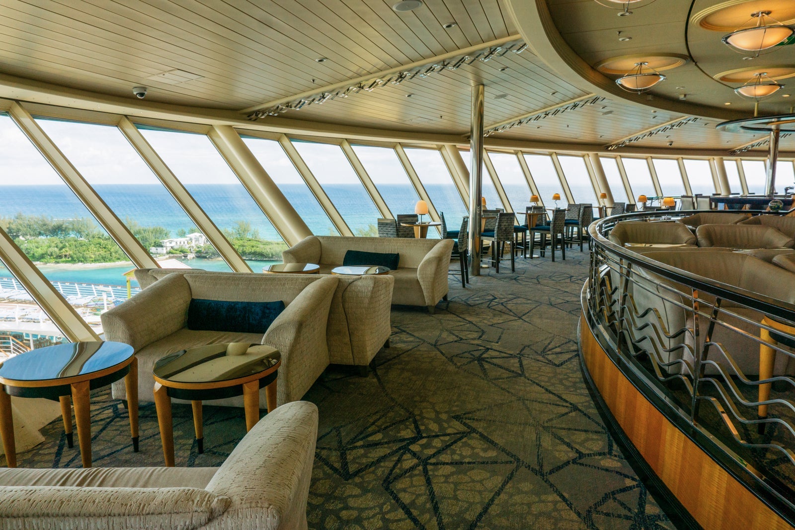 Our hands-down favorite bar and lounge is the Schooner Bar on Deck 4. This is the place for daily trivia sessions and nightly jams with the onboard pianist. With its pitch-soaked lines giving it a decidedly nautical fragrance and large circular windows, it's a cozy and inviting space, if far too small for the crowd that tends to gather here. Get here early for a seat, particularly at trivia.
