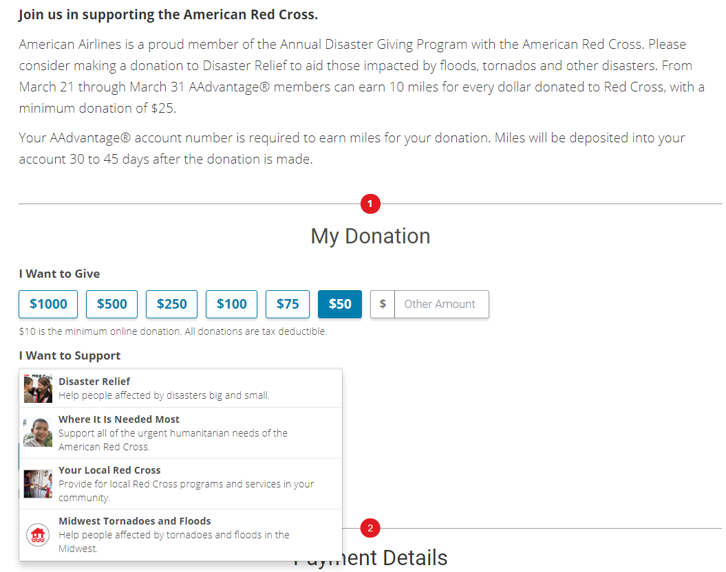 Now, you have even more reason to give: Through March 31, American Airlines will give AAdvantage members 10x miles per dollar donated to the Red Cross for donations of $25 or more.