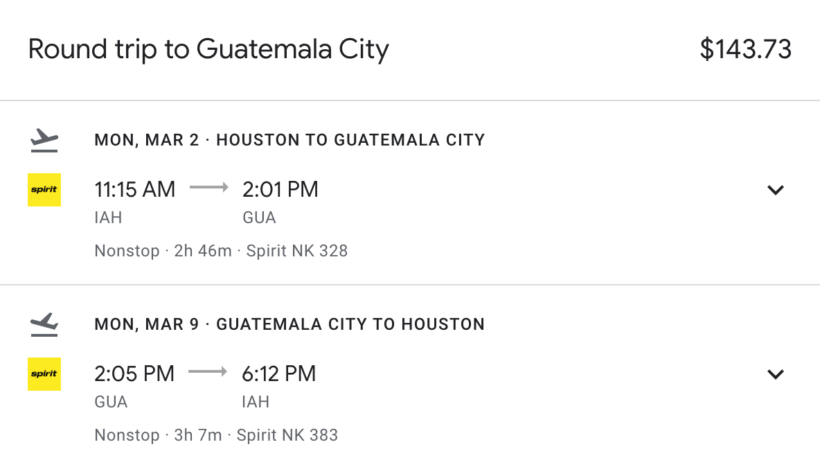 Houston (IAH) to Guatemala City (GUA) for $144 round trip on Spirit via Google:
