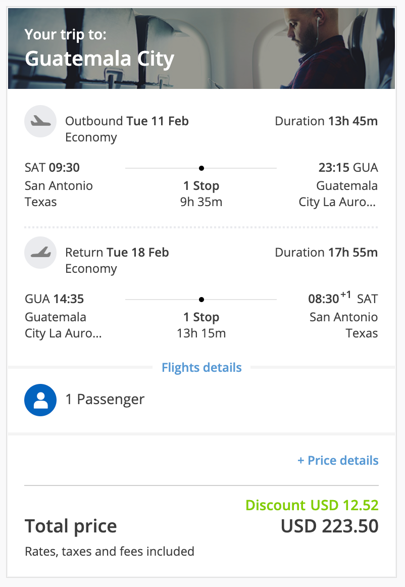 San Antonio (SAT) to Guatemala City (GUA) for $224 round trip on Interjet basic economy via Bravofly: