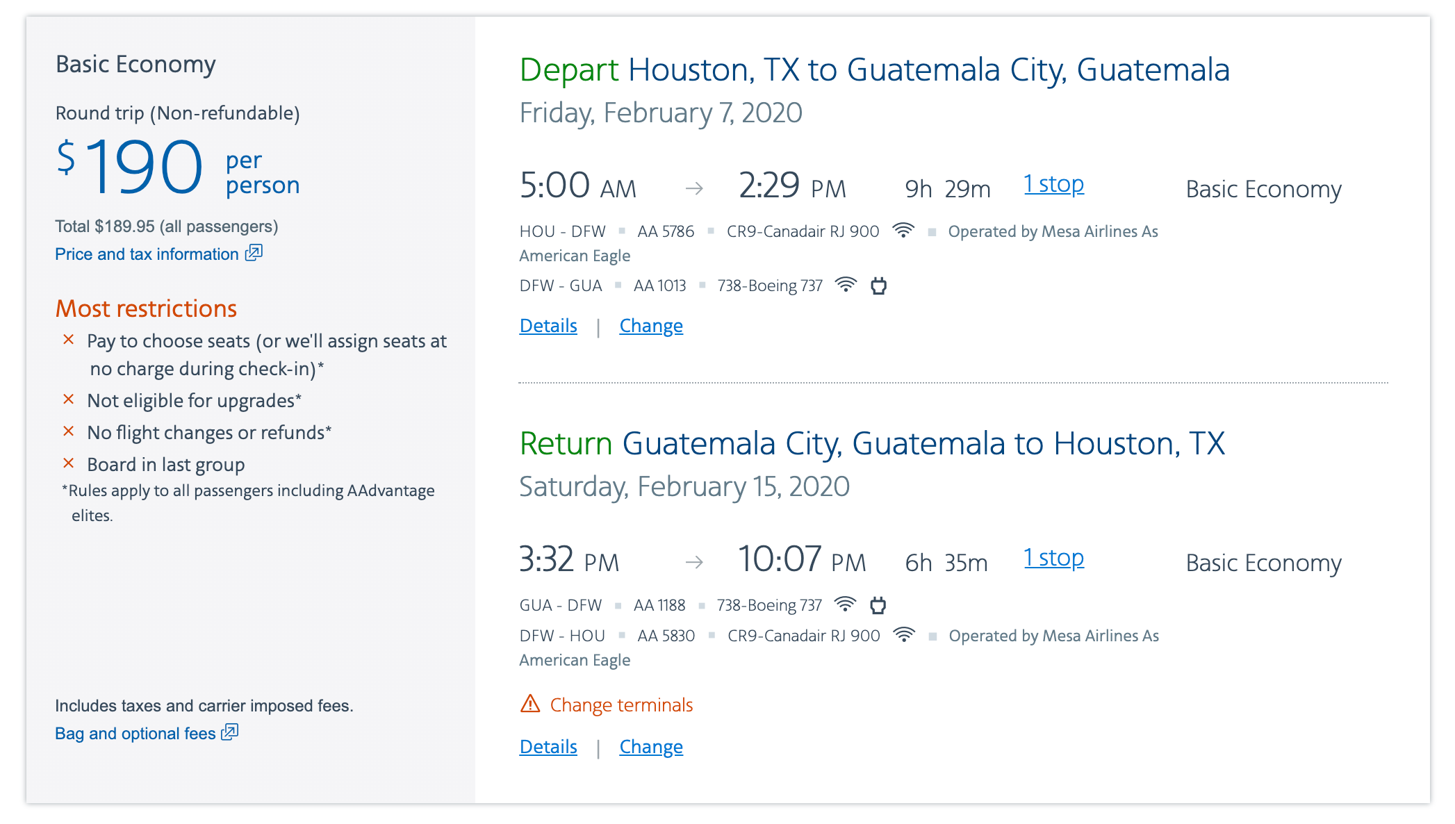 Houston (HOU) to Guatemala City (GUA) for $190 round trip on American basic economy: