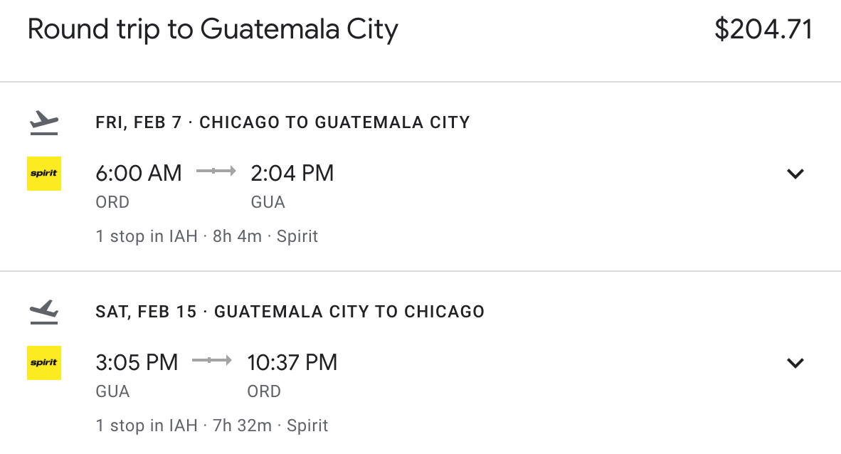 Chicago (ORD) to Guatemala City (GUA) for $205 round trip on Spirit via Google: