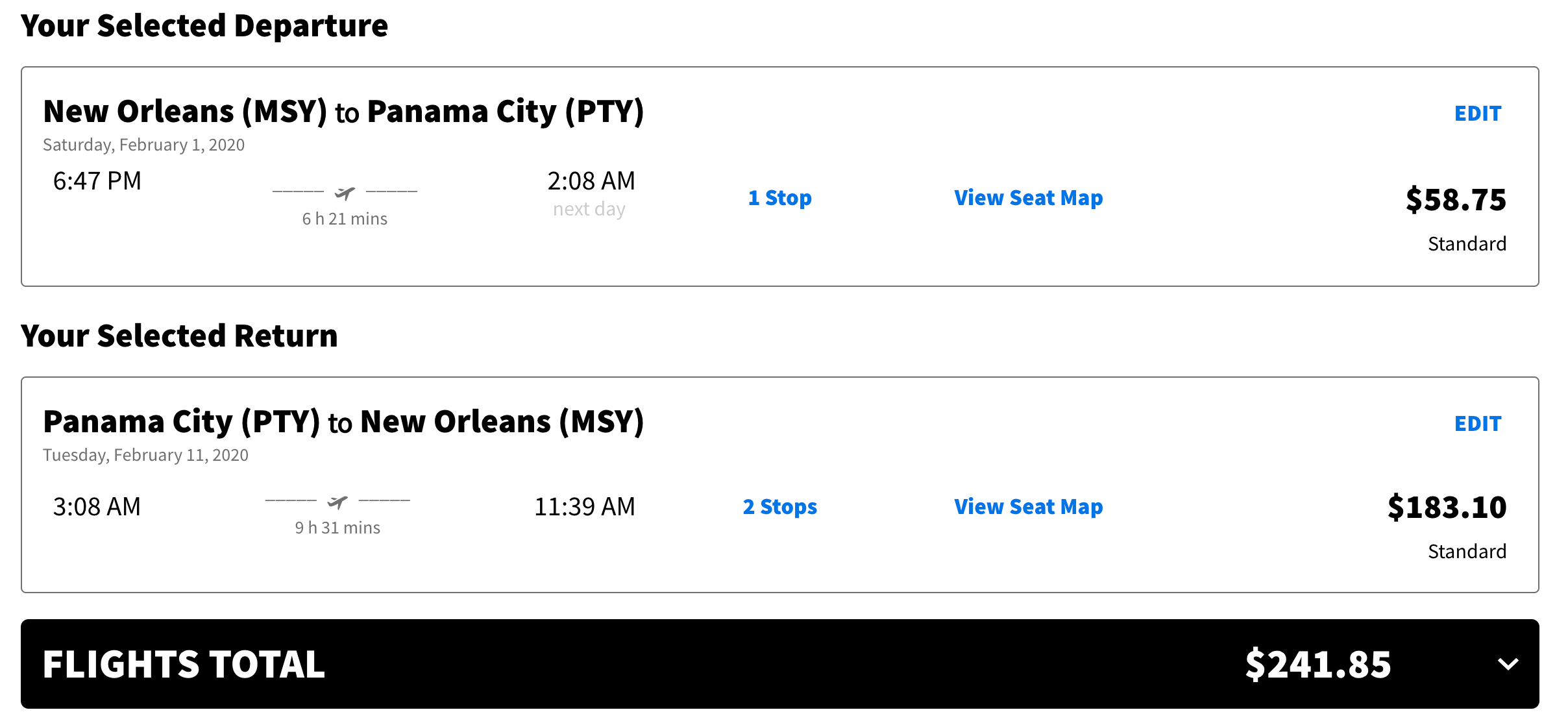 New Orleans (MSY) to Panama City (PTY) for $242 round trip on Spirit: