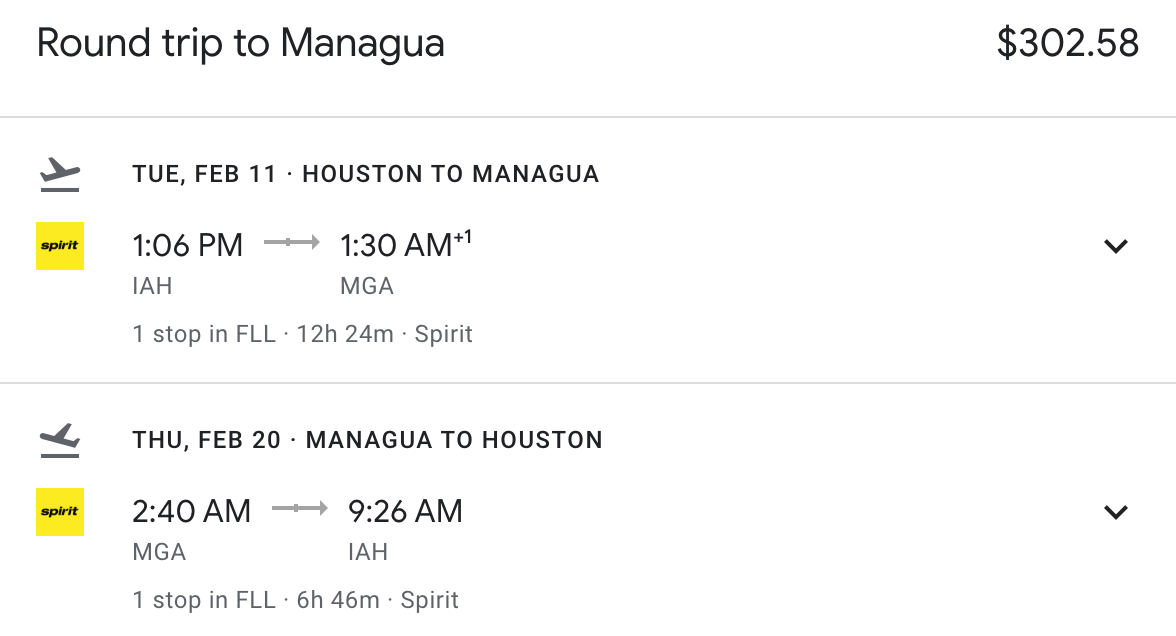 Houston (IAH) to Managua, Nicaragua (MGA) for $303 round trip on Spirit via Google: