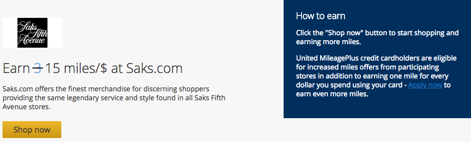 Both the American and United shopping portals are offering 15 miles per dollar spent at Saks.com. However, both portals have additional promotions that can stack with the elevated offers.