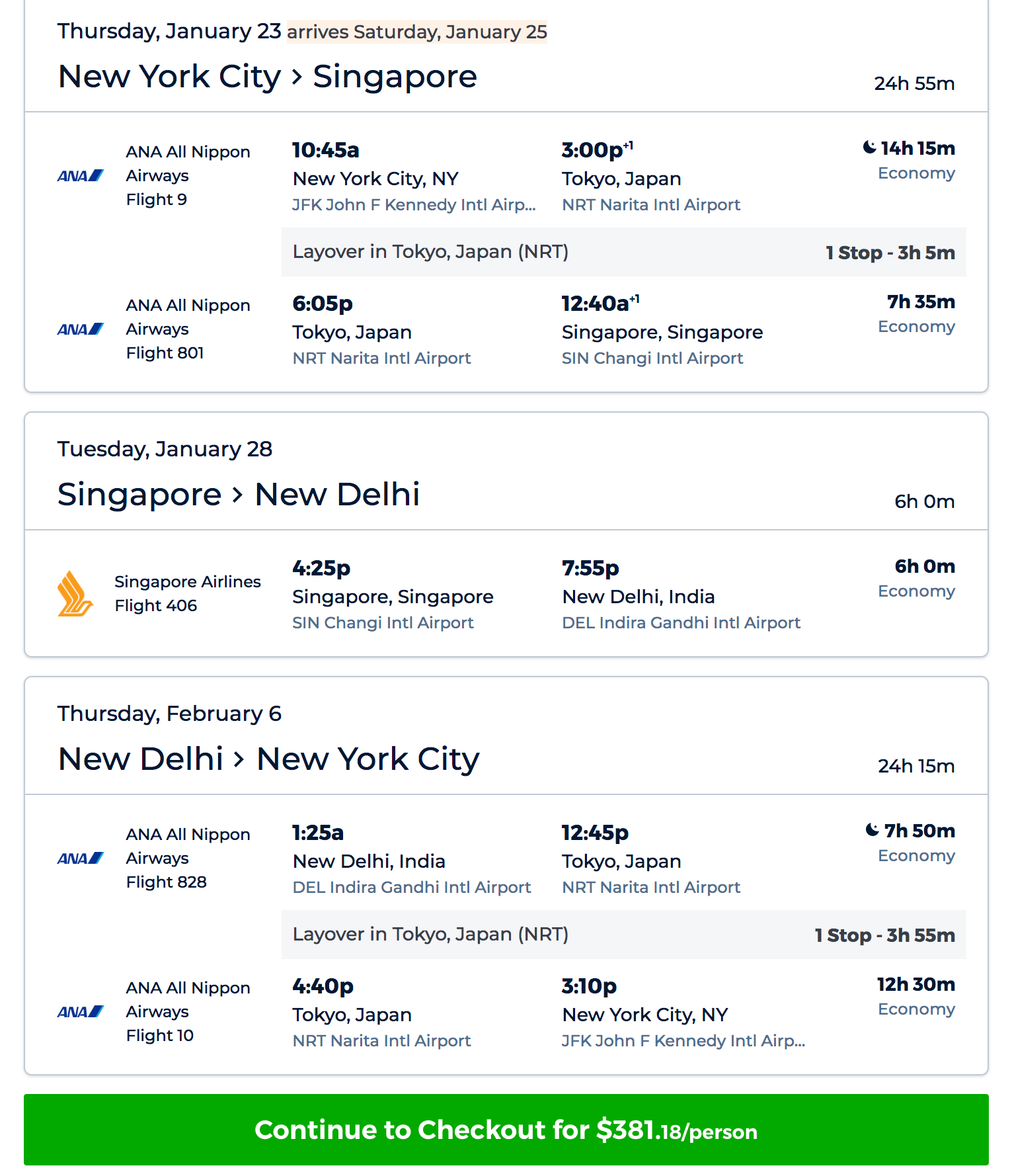 New York (JFK) to Singapore (SIN) and New Delhi (DEL) for $381 round-trip via Priceline: