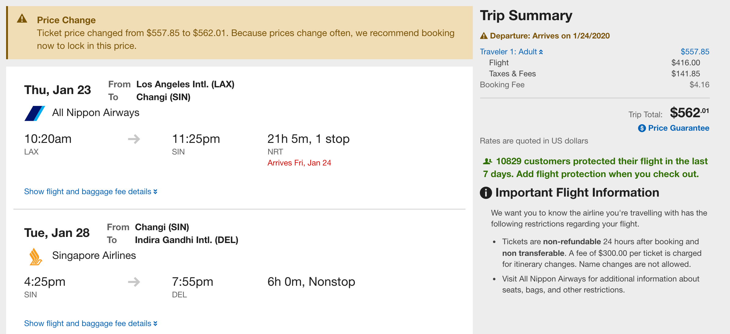 Los Angeles (LAX) to Singapore (SIN) and New Delhi (DEL) for $562 round-trip via Expedia:
