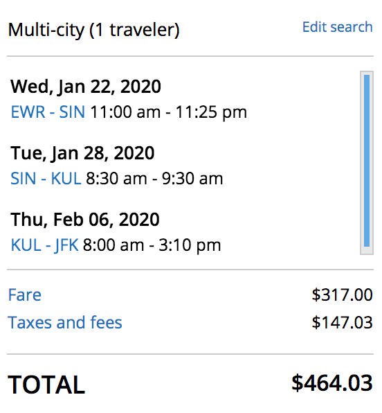 Newark (EWR) to Singapore (SIN) and Kuala Lumpur (KUL) for $464 round-trip: