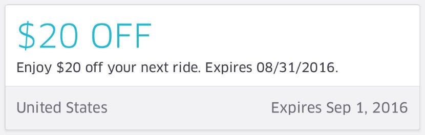 New Uber customers can often score a free ride (up to $20) by signing up via a referral link (such as TPG's here), but it's very unusual for a $20 discount to be available for existing customers as well. For the time being, even current Uber customers can score a free ride (again, up to $20) by entering promo code RIDEFREE16 on the promotions tab of the app. This credit appears to be valid in the United States and must be redeemed by August 31, 2016 (or possibly September 1).