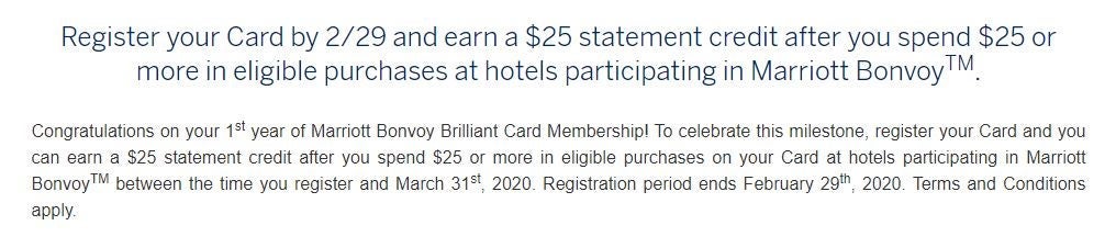 You will receive a $25 statement after spending $25 or more on Marriott purchases from now until March 31, 2020. You must register for the promotion by February 29 and complete spending by March 31 to receive the statement credit. Note that purchases like balance transfers, cash advances, purchases of traveler's checks, purchases or reloading of prepaid cards, purchases of gift cards, person-to-person payments, or purchases of any cash equivalents aren't allowed.
