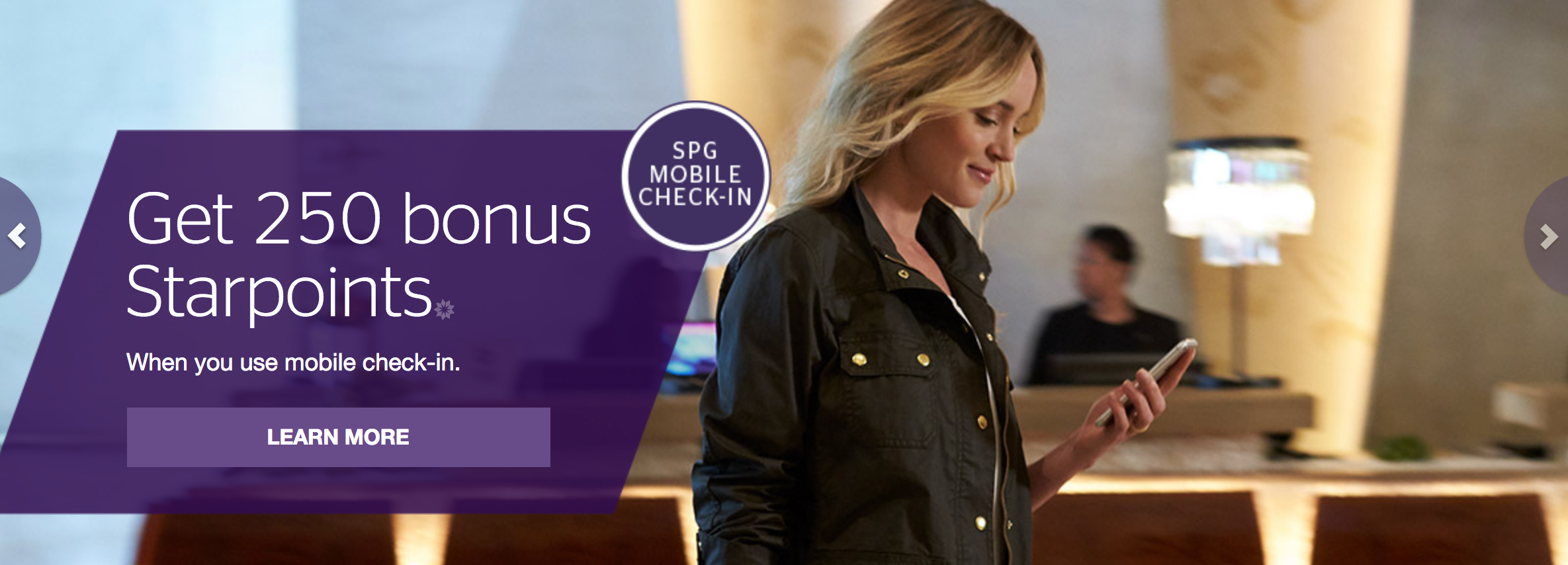 Starwood Preferred Guest is incentivizing members to utilize its mobile check-in service by offering bonus Starpoints. Through June 15, 2018, you can earn 250 Starpoints per check-in via the mobile app at select brands.