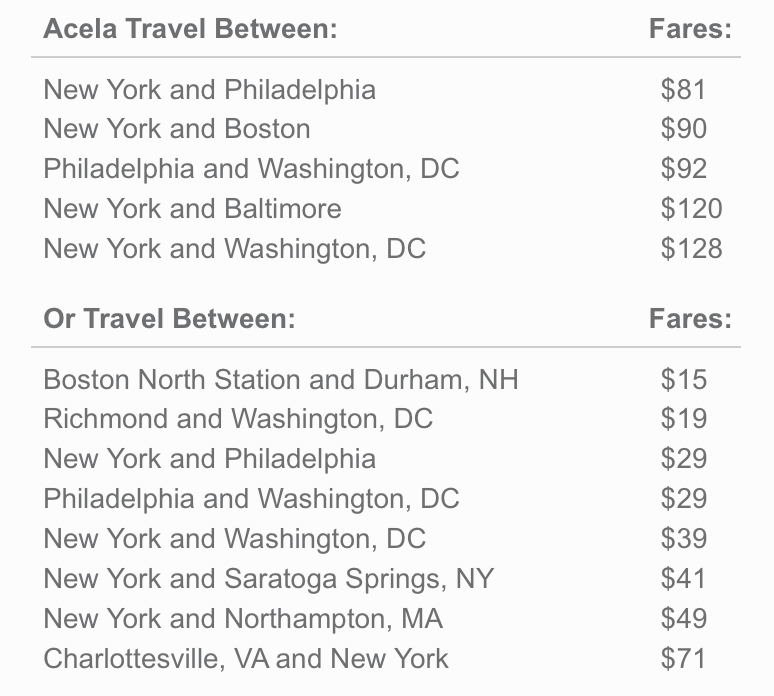 To get in on the savings, you must travel Feb. 15 - March 31, 2020. The promotion is valid for coach seats and Acela business class only. Last, it is only available on select train services.