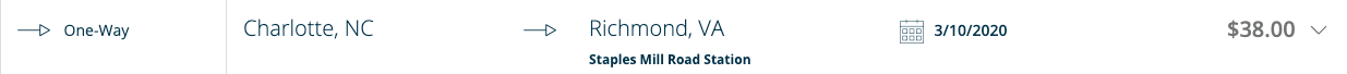 Charlotte, North Carolina, to Richmond, Virginia, for $38 one-way: