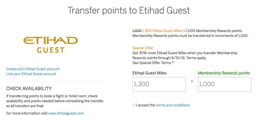 And now there's more good news! To celebrate the new partnership, Amex is offering a 30% bonus when you transfer points through June 15, 2016. Under the current promo, you'll get 1,300 Etihad Guest miles for every 1,000 Membership Rewards points you transfer. Not a bad deal!