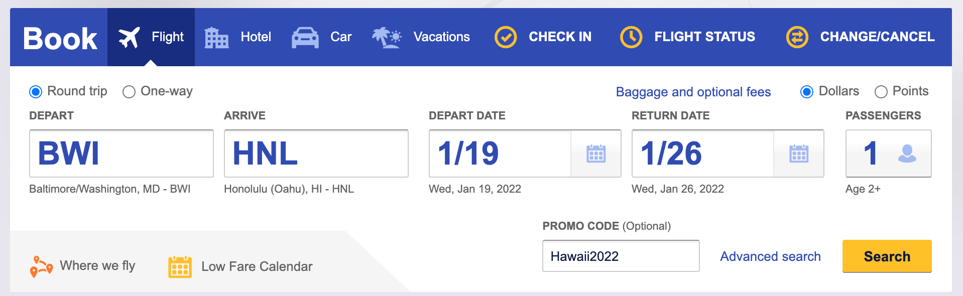 It's as easy as heading over to Southwest's website, entering your desired airports and dates (within Jan. 6 to March 9, 2022) and the promo code "Hawaii2022."