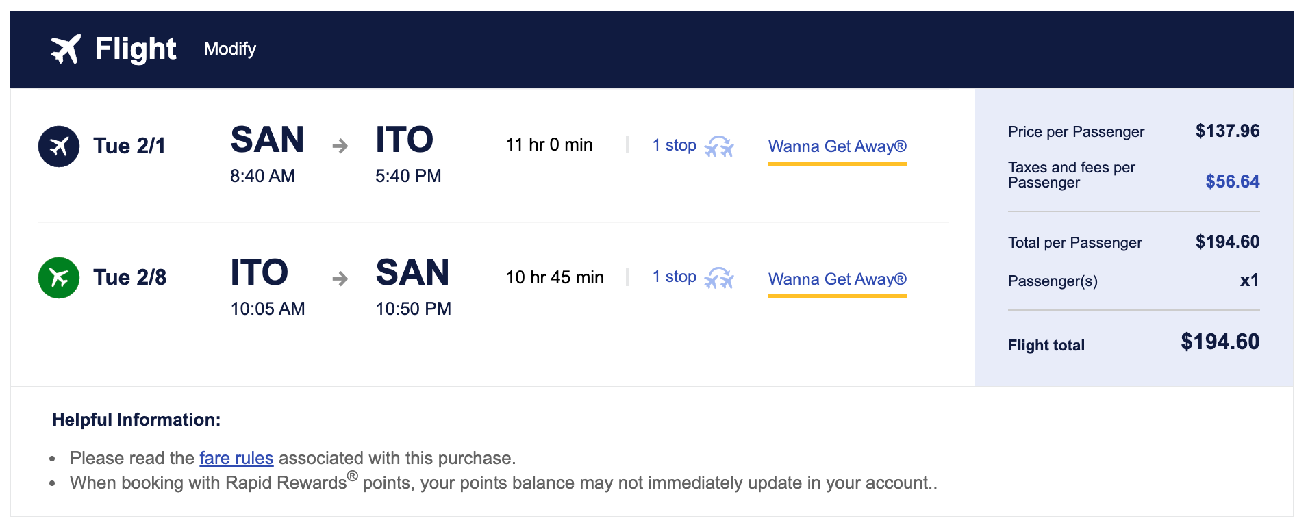 San Diego (SAN) to Hilo (ITO) for $195 round-trip