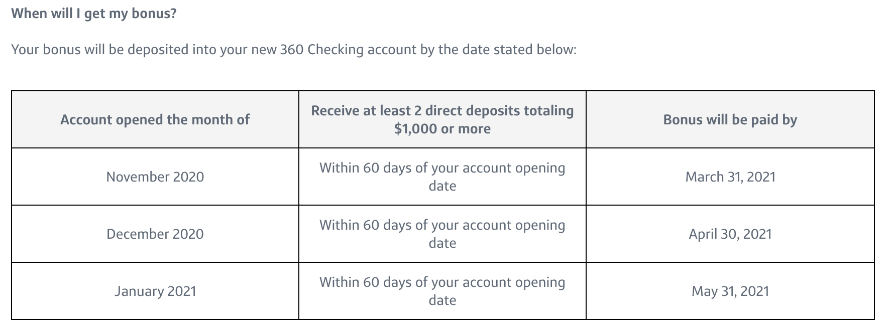 - Receive at least two direct deposits totaling $1,000 or more to your 360 Checking account within 60 days of account opening. A qualifying direct deposit is an Automated Clearing House (ACH) credit, which may include payroll, pension or government payments (such as Social Security) by your employer or an outside institution.