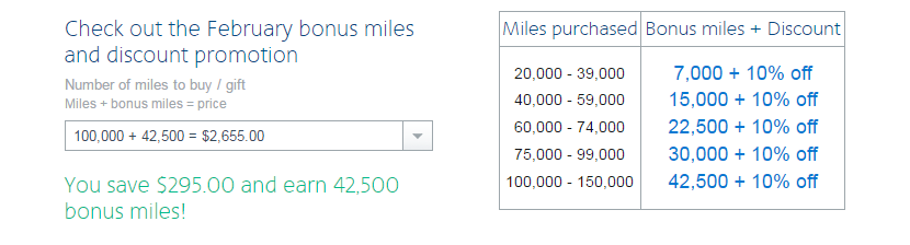 You’ll earn the maximum 42.5% bonus (42,500 miles) when you purchase exactly 100,000 miles. Or, you can earn up to a 37.5% bonus (15,000 miles) for buying 40,000 miles. You can even earn a 35% bonus (7,000 miles) for buying as few as 20,000 miles.